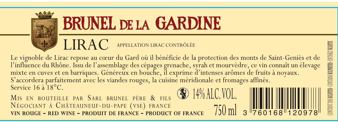 | Libellé | Brunel de La Gardine, 2019 - Lirac AOP - Rouge - 75 cl |