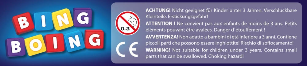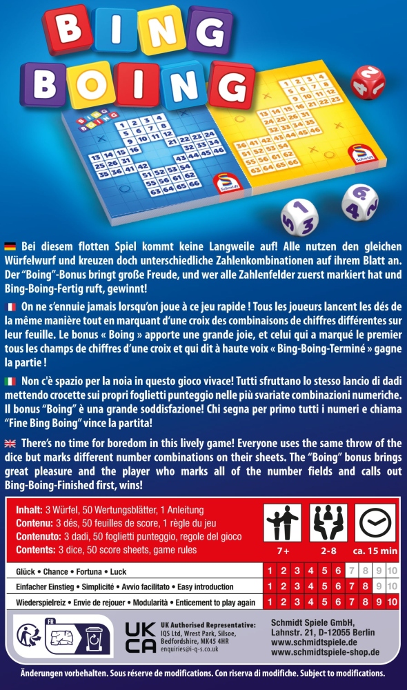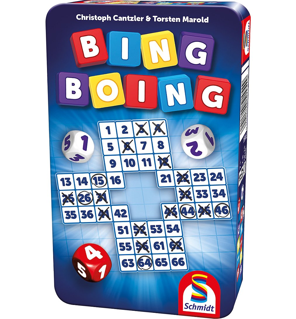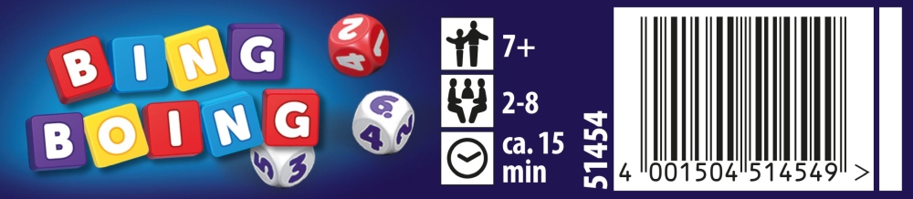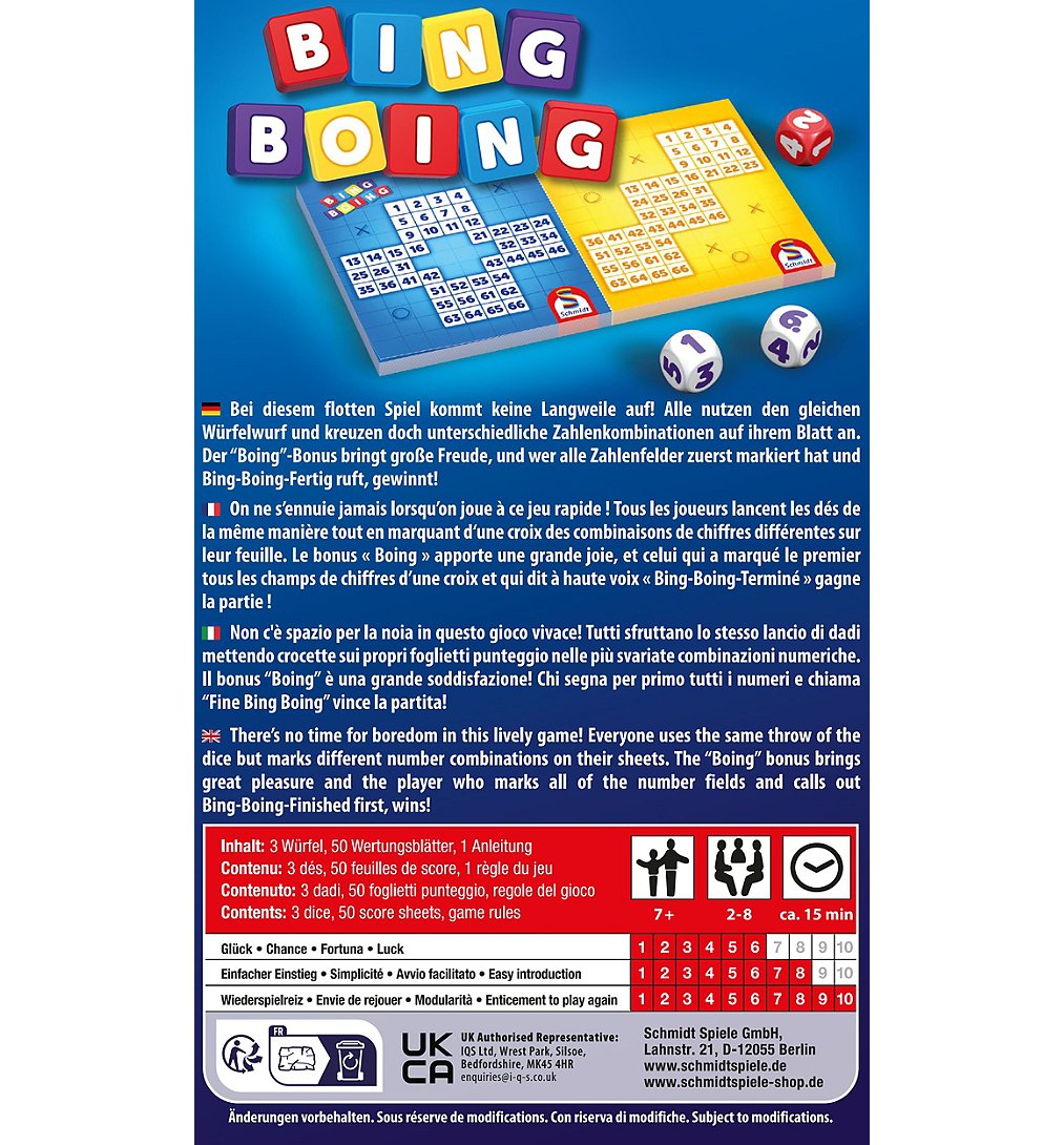 « Bing - Boing » On ne s’ennuie jamais lorsqu’on joue à ce jeu rapide ! Tous les joueurs lancent les dés de la même manière tout en marquant d‘une croix des combinaisons de chiffres différentes sur leur feuille. Le bonus « Boing » apporte une grande joie, et celui qui a marqué le premier tous les champs de chiffres d’une croix et qui dit à haute voix « Bing-Boing-Terminé » gagne la partie !