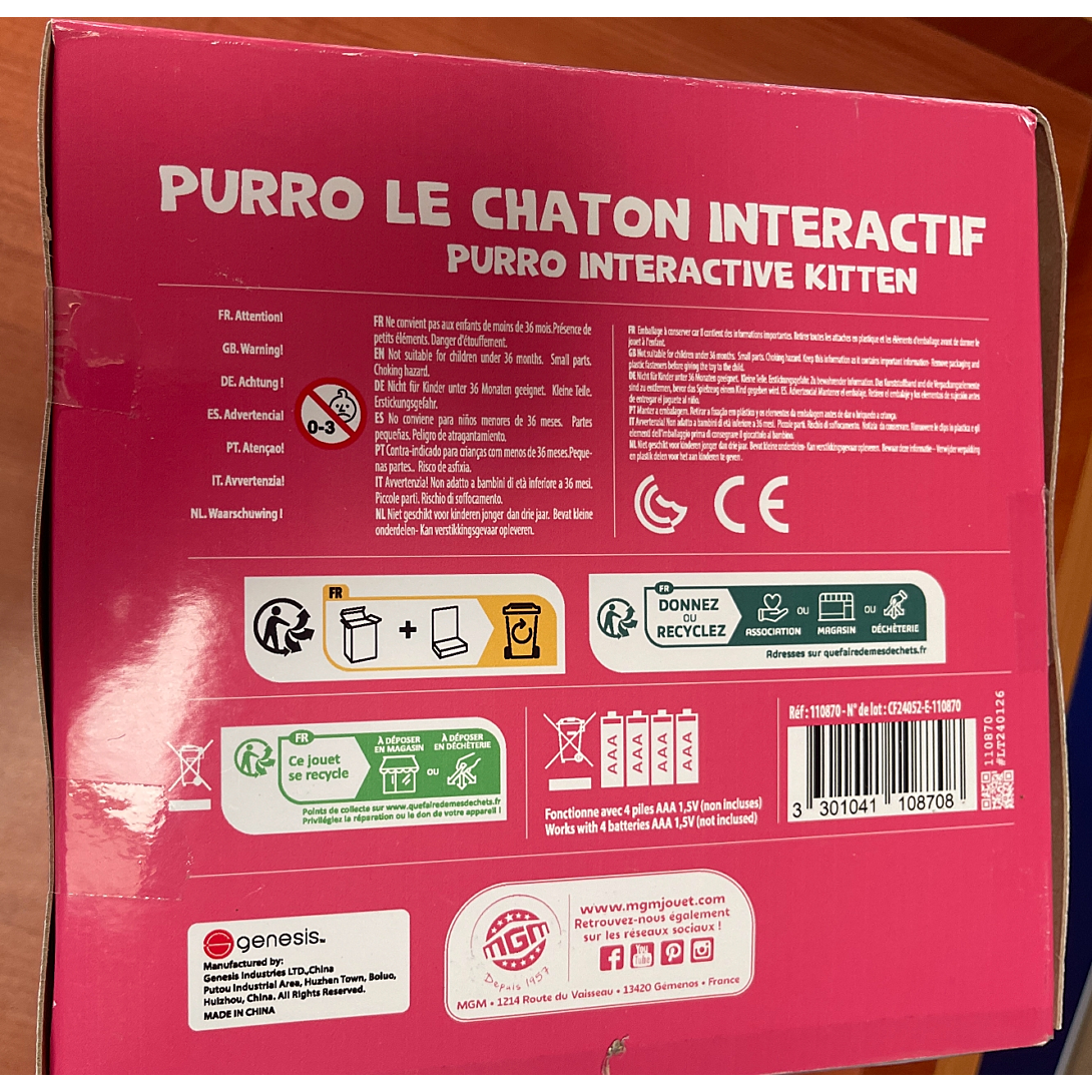 | Libellé | BTE/PURRO CHATON INTERACTIF -SE DEPLACE - RONRONNE - MIAULE - REPETE - REAGIT AUX EMOTIONS - PILES NON INCL - APD 5 ANS |