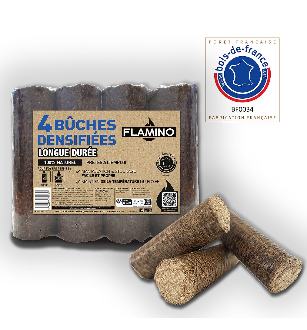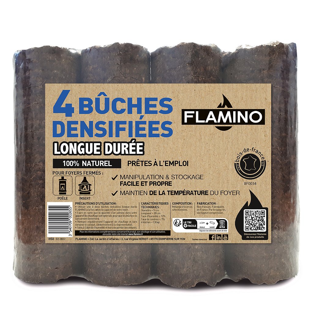 Pour foyers fermés (poêle, insert). Diamètre 9cm. Longueur 28cm. Cylindre plein. Mélange d'écorces sélectionnées, séché, broyé et compressé. Maintien de le température du foyer. Longue durée. Chaleur douce et diffuse dans flamme. Prêt à l'emploi.