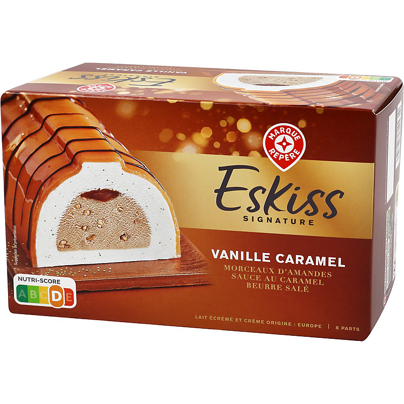 Bûche glacée composée d'une crème glacée à la vanille (55,5 %), d'une crème glacée au caramel aromatisée (27,4 %) avec des morceaux d'amandes caramélisés (2,2 %), d'une sauce au caramel au beurre salé (3,1 %) et d'un enrobage au caramel (11,2 %). Décor : chocolat noir. ESKISS