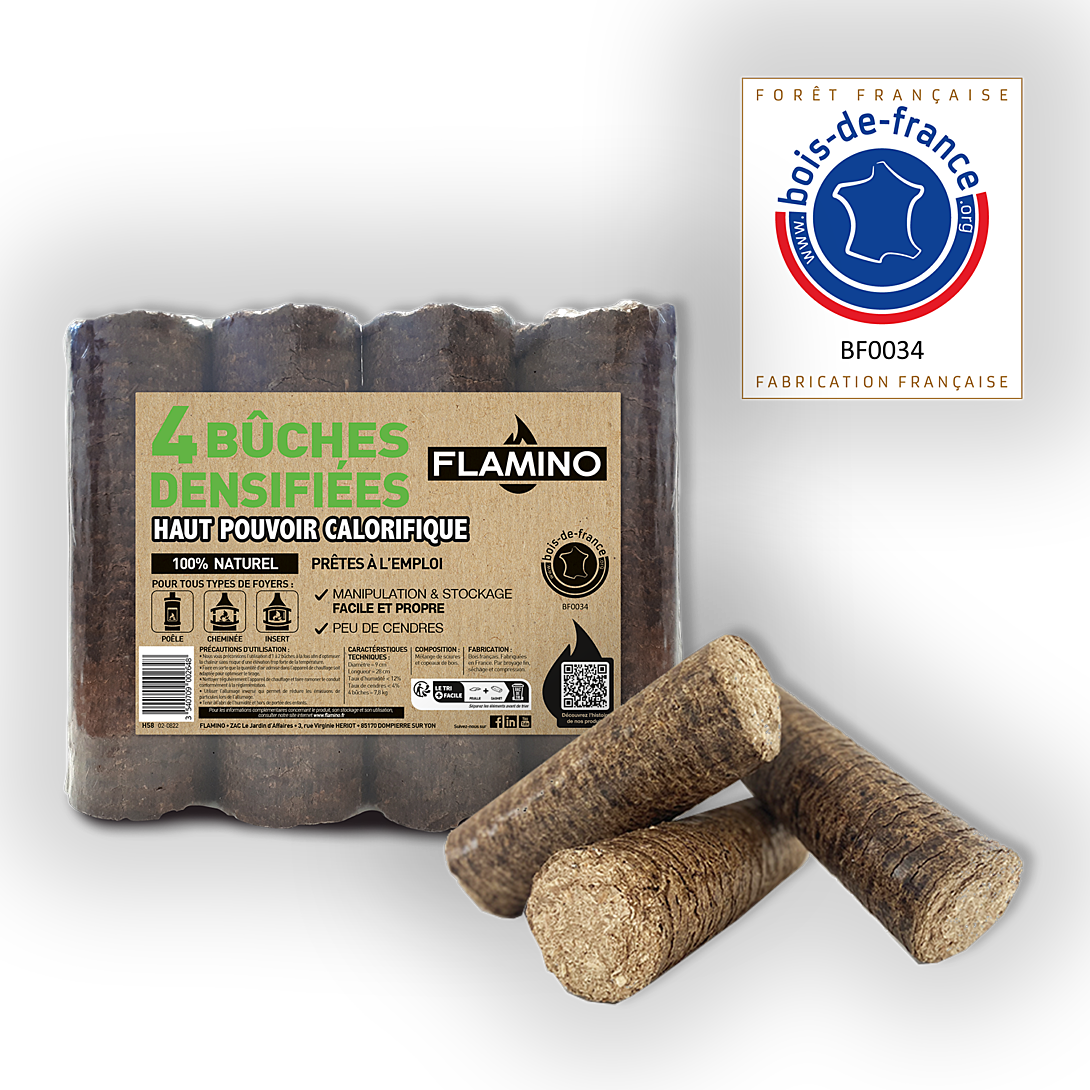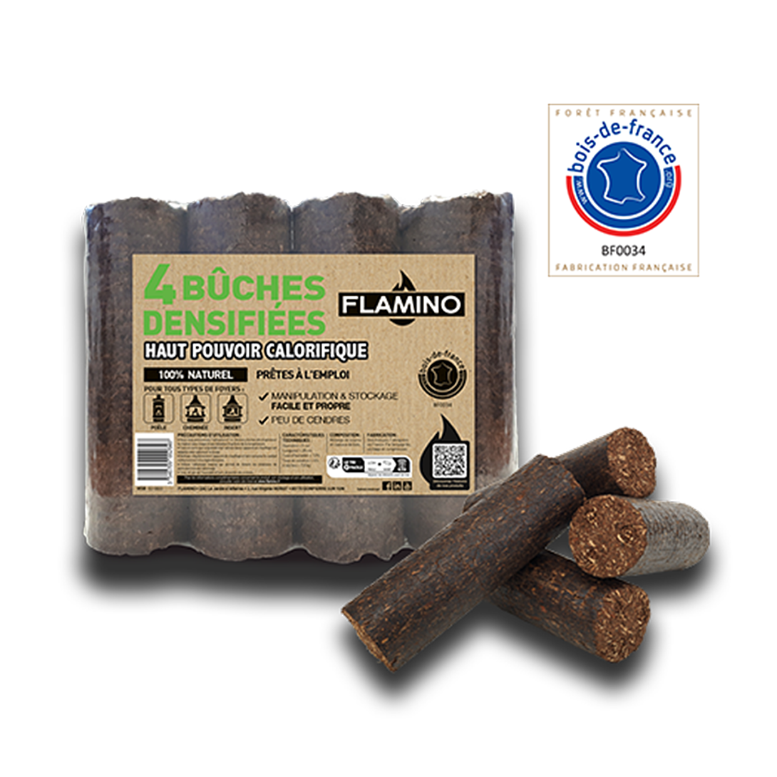 Bûches densifiées haut pouvoir calorifique. Pour tous types de foyers. Sciures et copeaux compressés : hêtre, chêne, frêne, charme, sapin, douglas, épicéa, pin. Peu de cendres, stockage facile et propre. Fabrication 100% française