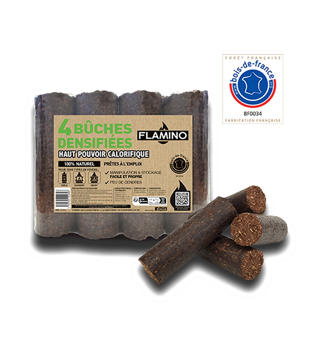 Bûches densifiées haut pouvoir calorifique. Pour tous types de foyers. Sciures et copeaux compressés : hêtre, chêne, frêne, charme, sapin, douglas, épicéa, pin. Peu de cendres, stockage facile et propre. Fabrication 100% française