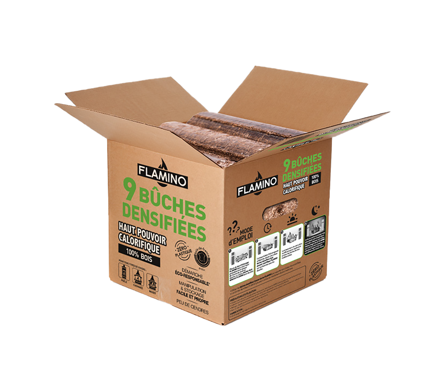 Bûches densifiées haut pouvoir calorifique x9 Pour tous types de foyers - Sciures et copeaux de bois compressés - Peu de cendres - Stockage facile et propre