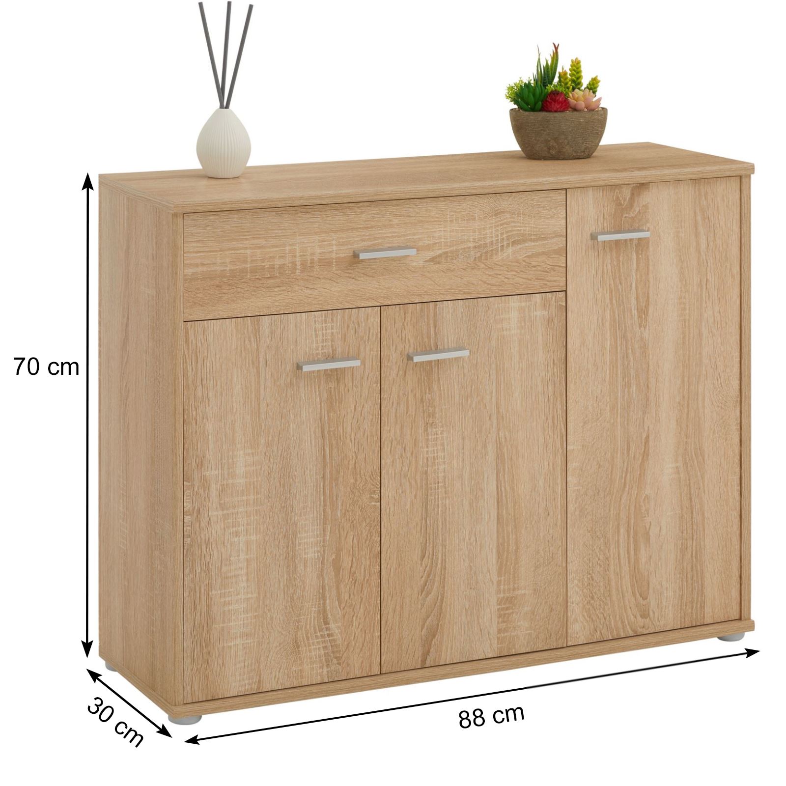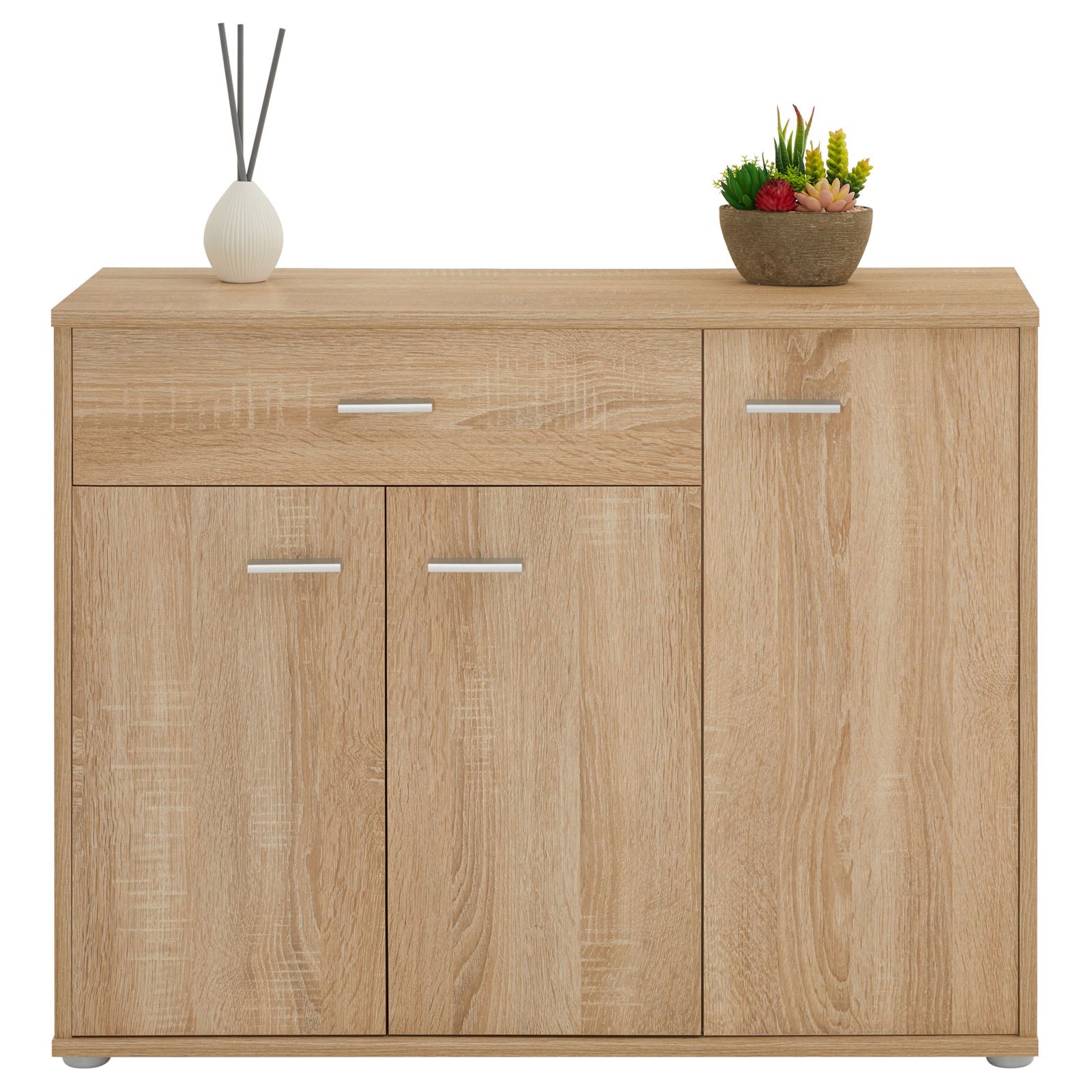 Buffet CORALINE, commode meuble de rangement avec 1 tiroir et 3 portes, en mélaminé décor chêne sonoma