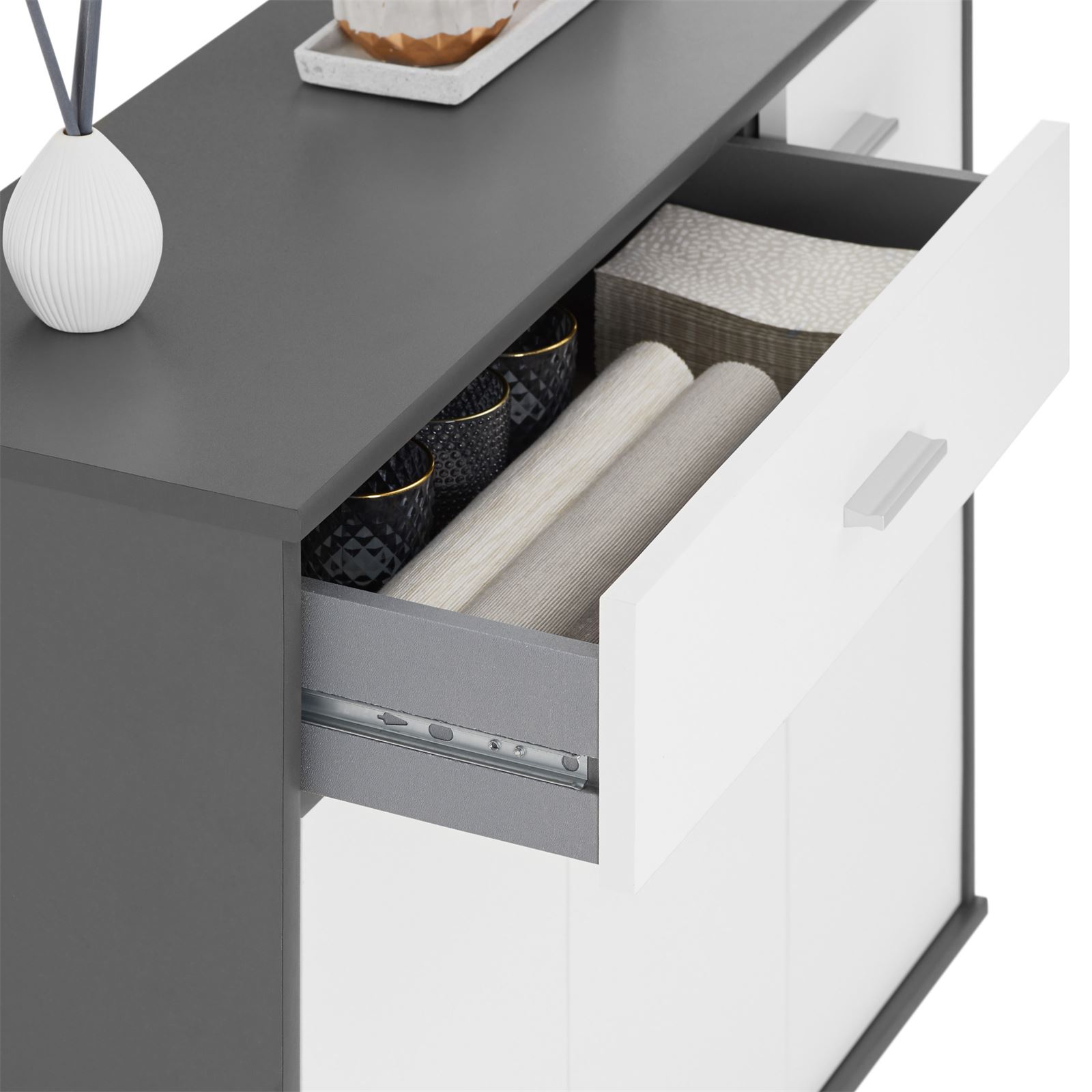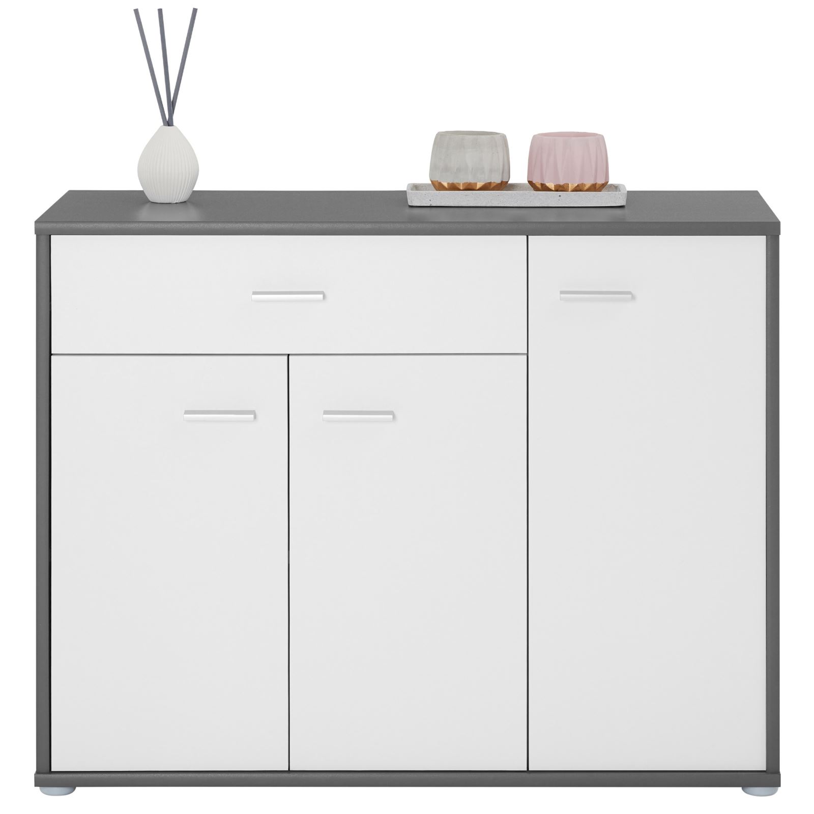 Buffet CORALINE, commode meuble de rangement avec 1 tiroir et 3 portes, en mélaminé gris mat et blanc mat