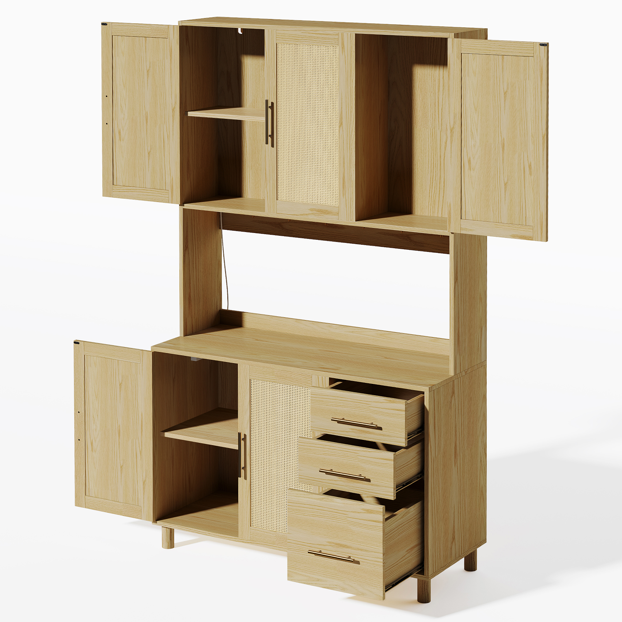 Buffet de Cuisine Bois Haut.183cm avec Lumières LED et Prises/USB, Tiroirs, Placards et Crochets, Étagère