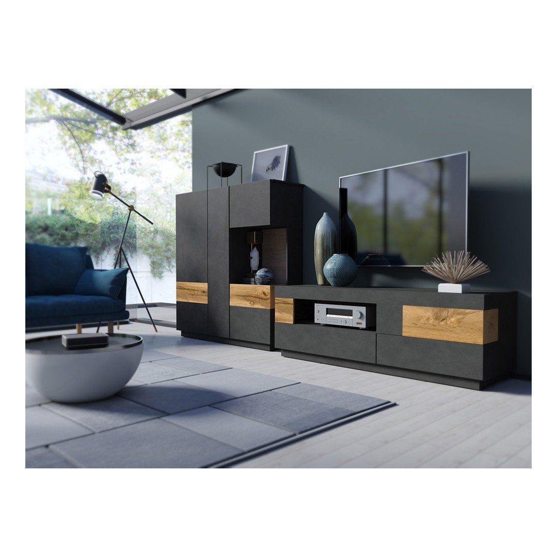 Buffet haut KILES trois portes avec LED. Coloris gris anthracite et chêne. Style design