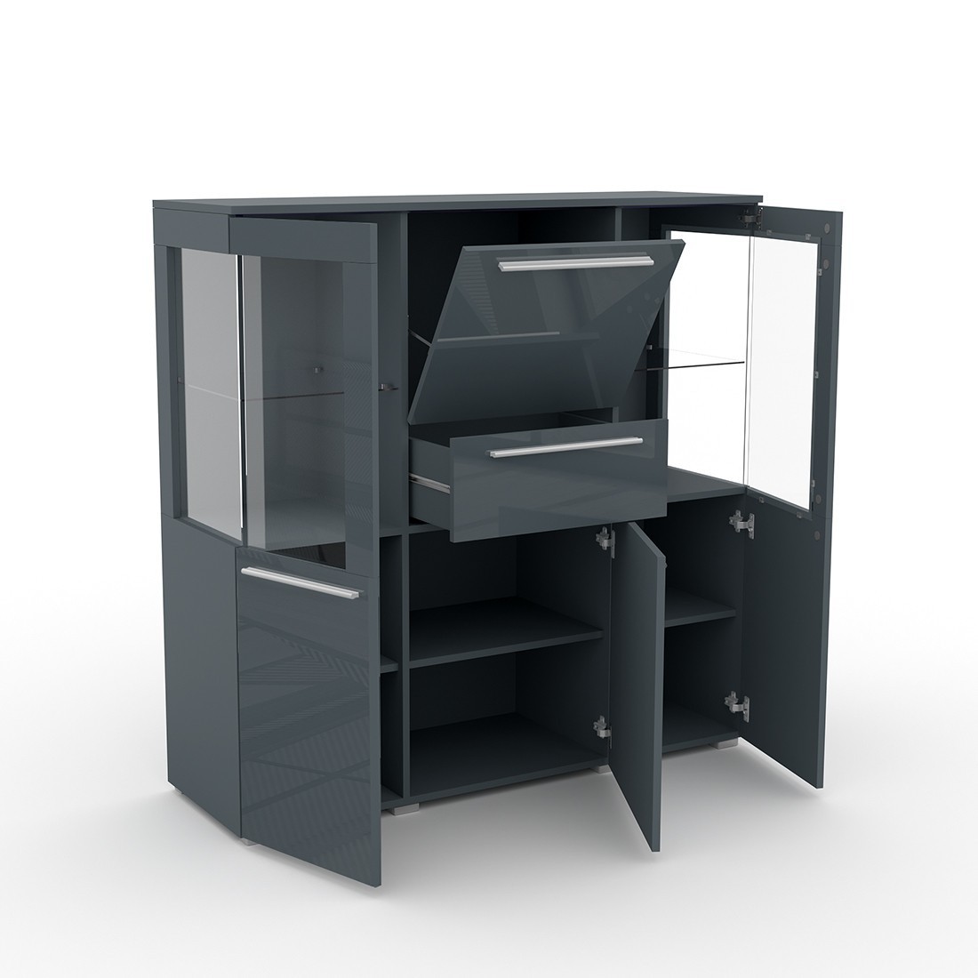 Buffet haut pour salon gris brillant avec LED multicolore intégré, collection BOMBAY