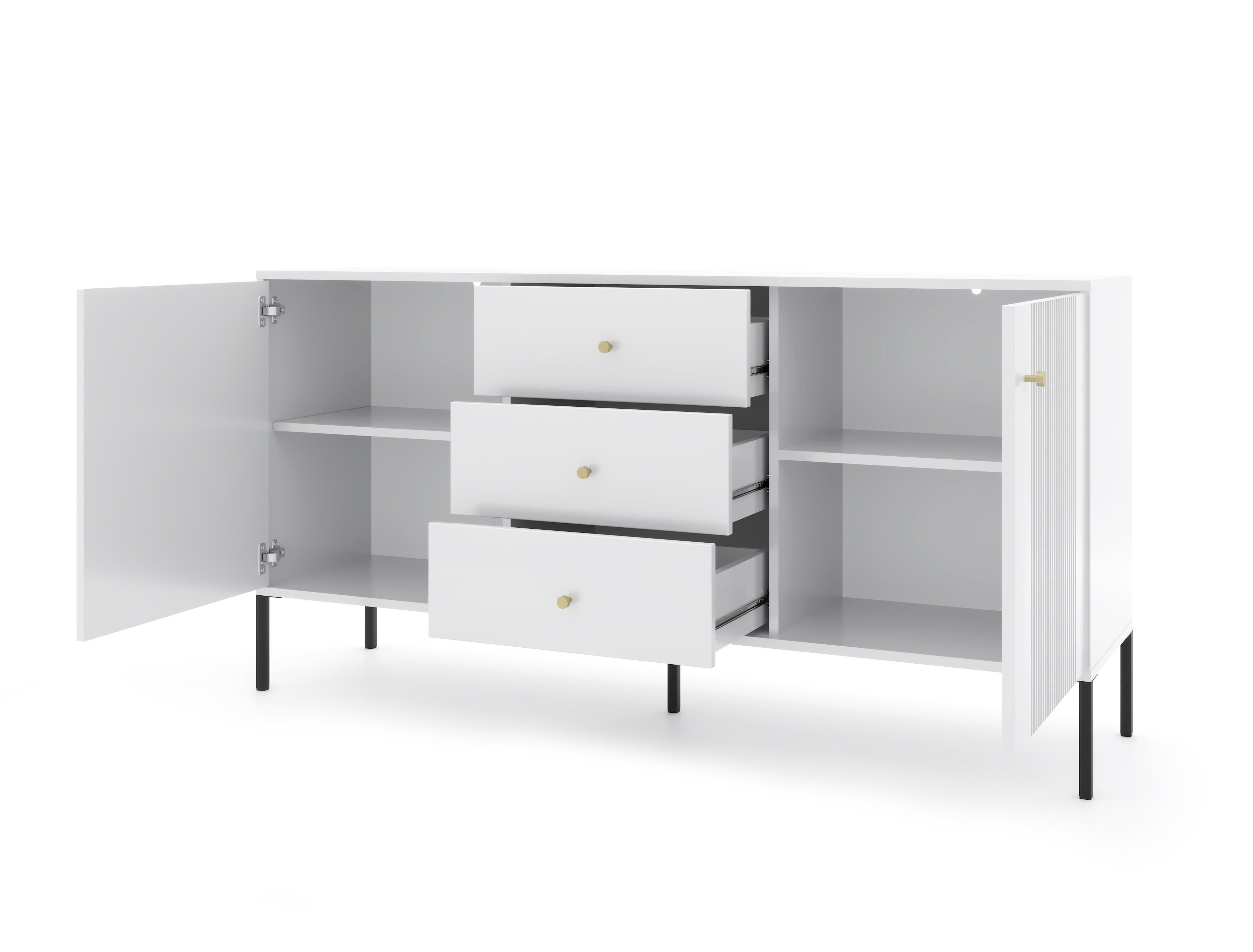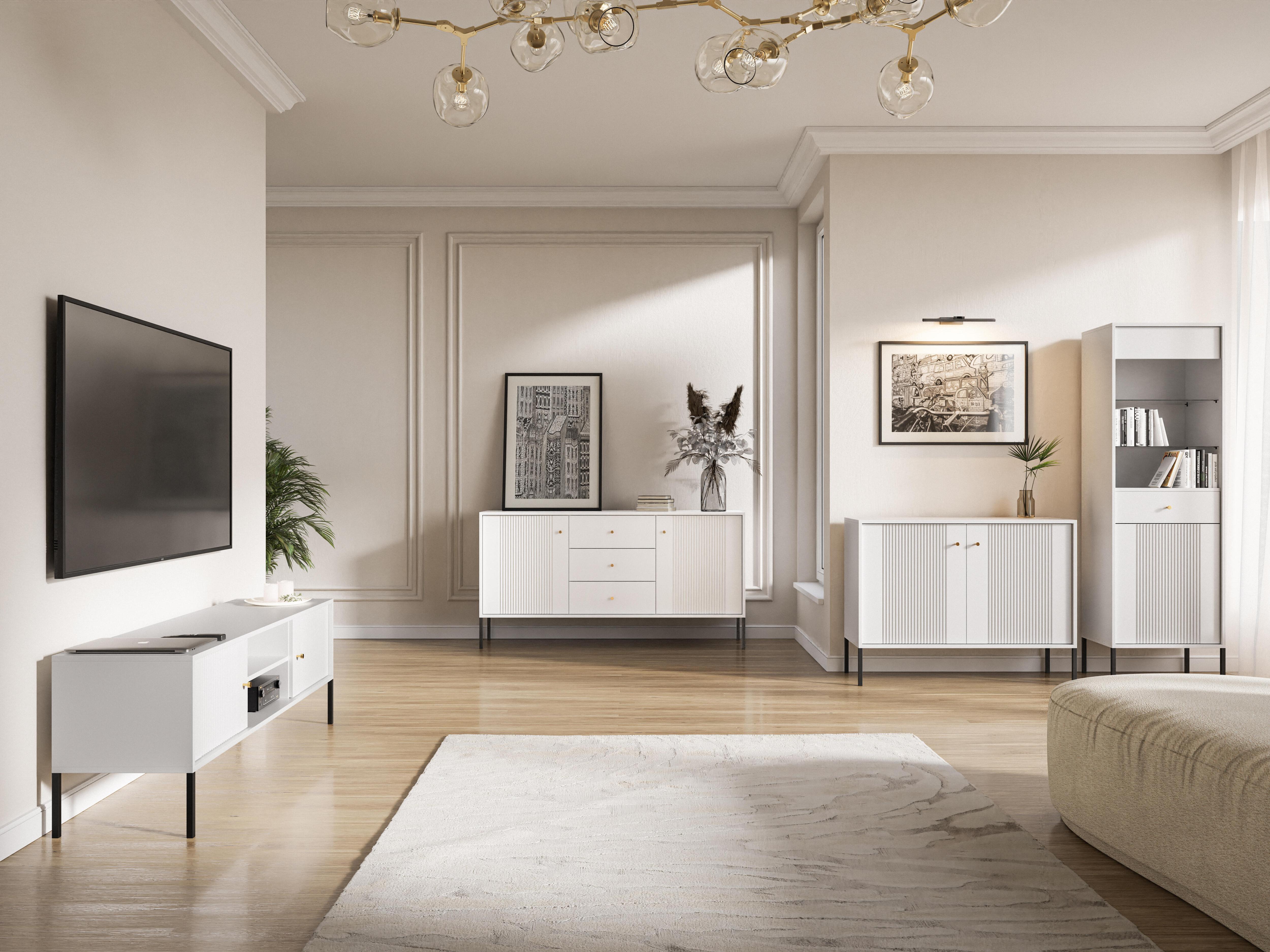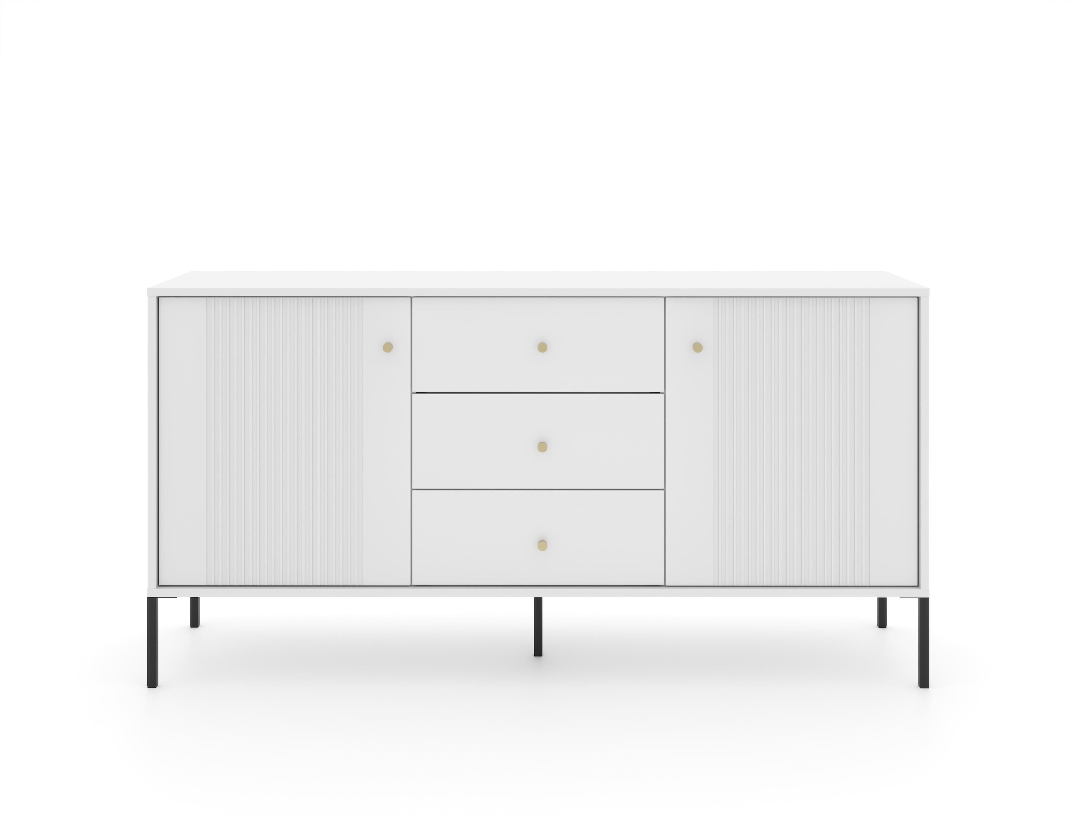 Le buffet ISEO en blanc et noir combine harmonieusement l'élégance et de grandes capacités de rangement. Cette pièce mesure 79x154x39 cm et est construite en bois d'ingénierie et en acier, offrant un cadre robuste avec une esthétique chic. Il comprend quatre étagères et trois tiroirs derrière deux portes battantes, offrant une solution de rangement polyvalente pour tout, du linge de maison à la vaisselle. Le style moderne, accentué par une finition blanche et noire, garantit que ce buffet est aussi élégant que fonctionnel.