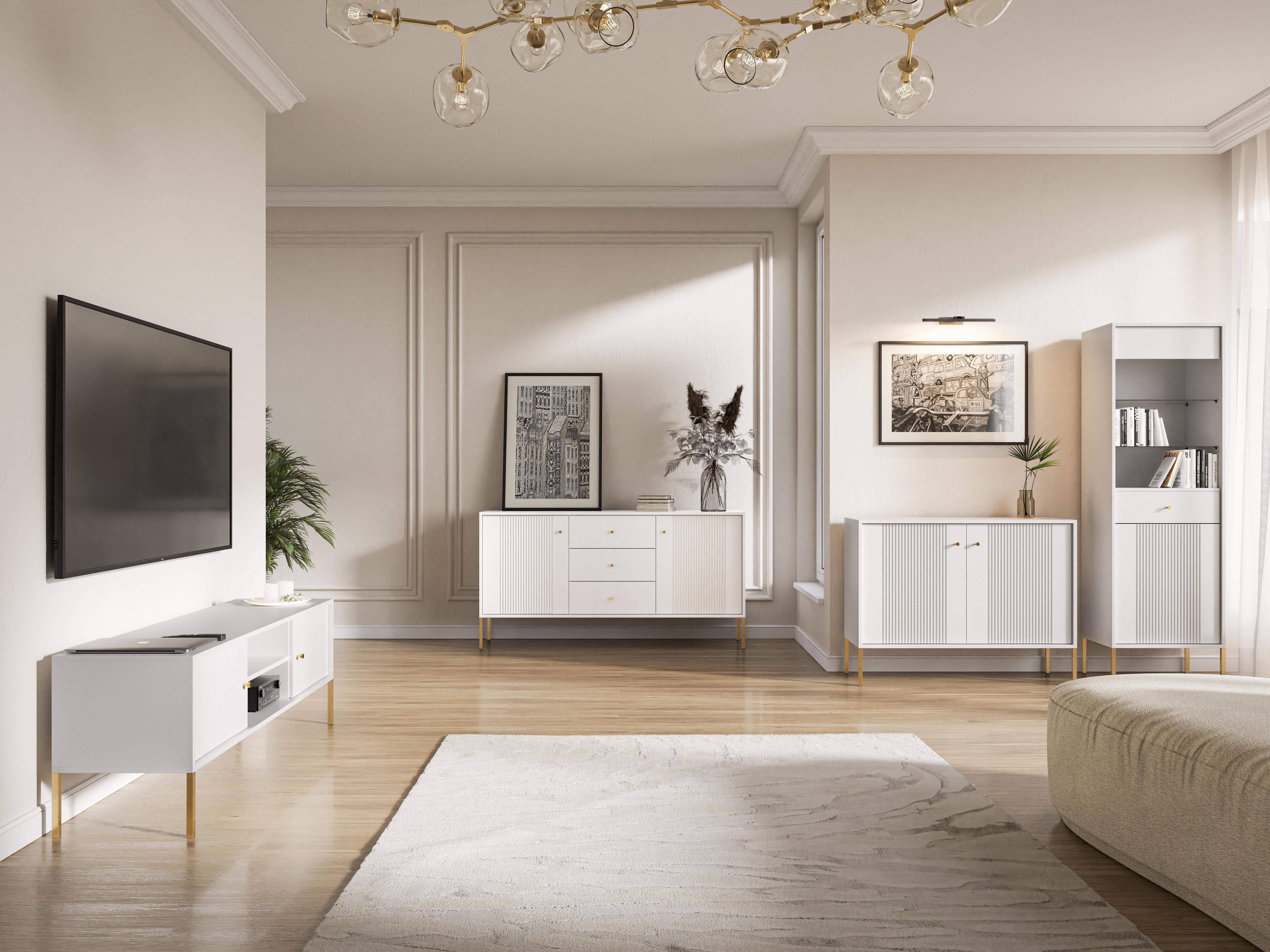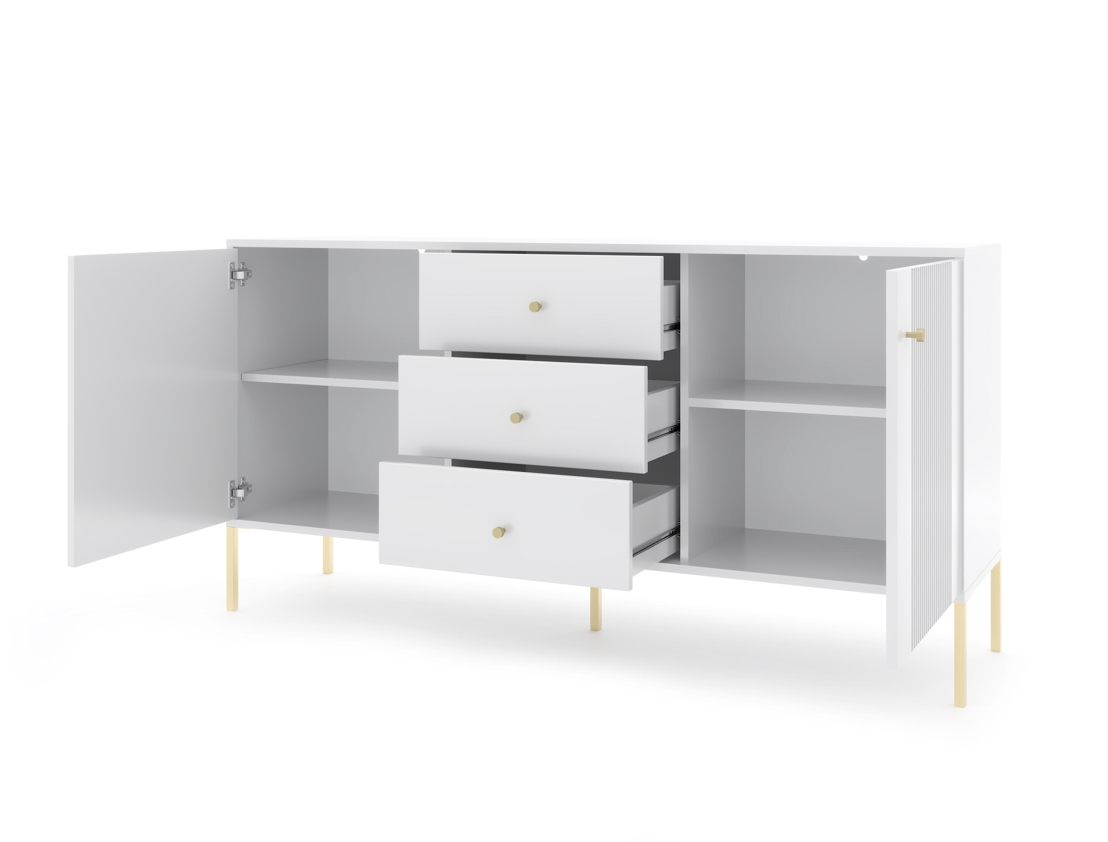 Le buffet ISEO en blanc et or, mesurant 79x154x39 cm, est une fusion d'élégance et de fonctionnalité. Construit en bois d'ingénierie et en acier, ce meuble présente une finition blanche et dorée qui respire le luxe. Il comprend quatre étagères et trois tiroirs derrière deux portes à charnières, offrant ainsi un vaste espace de rangement. Son design moderne et sa finition captivante en font une pièce essentielle pour organiser votre intérieur avec style.
