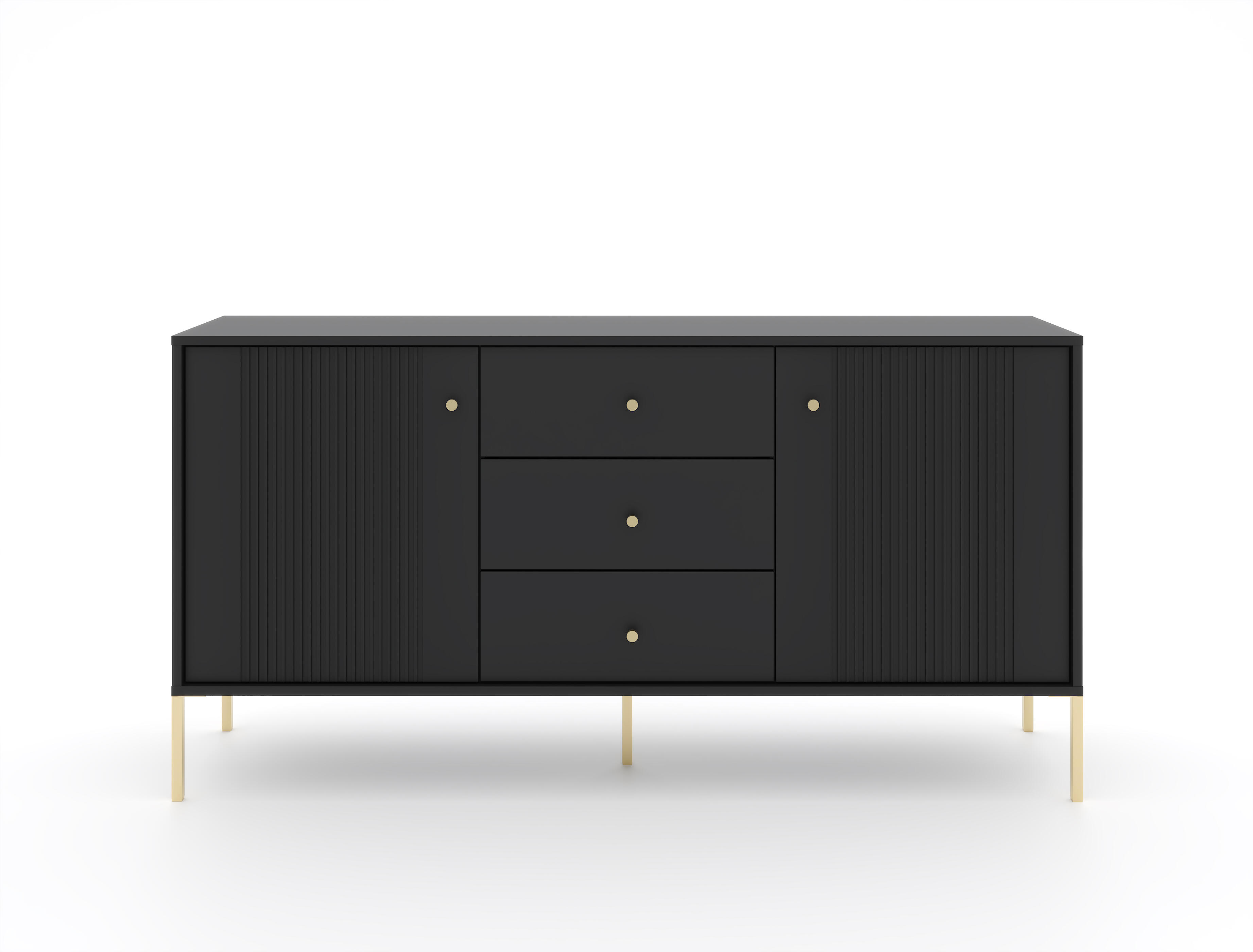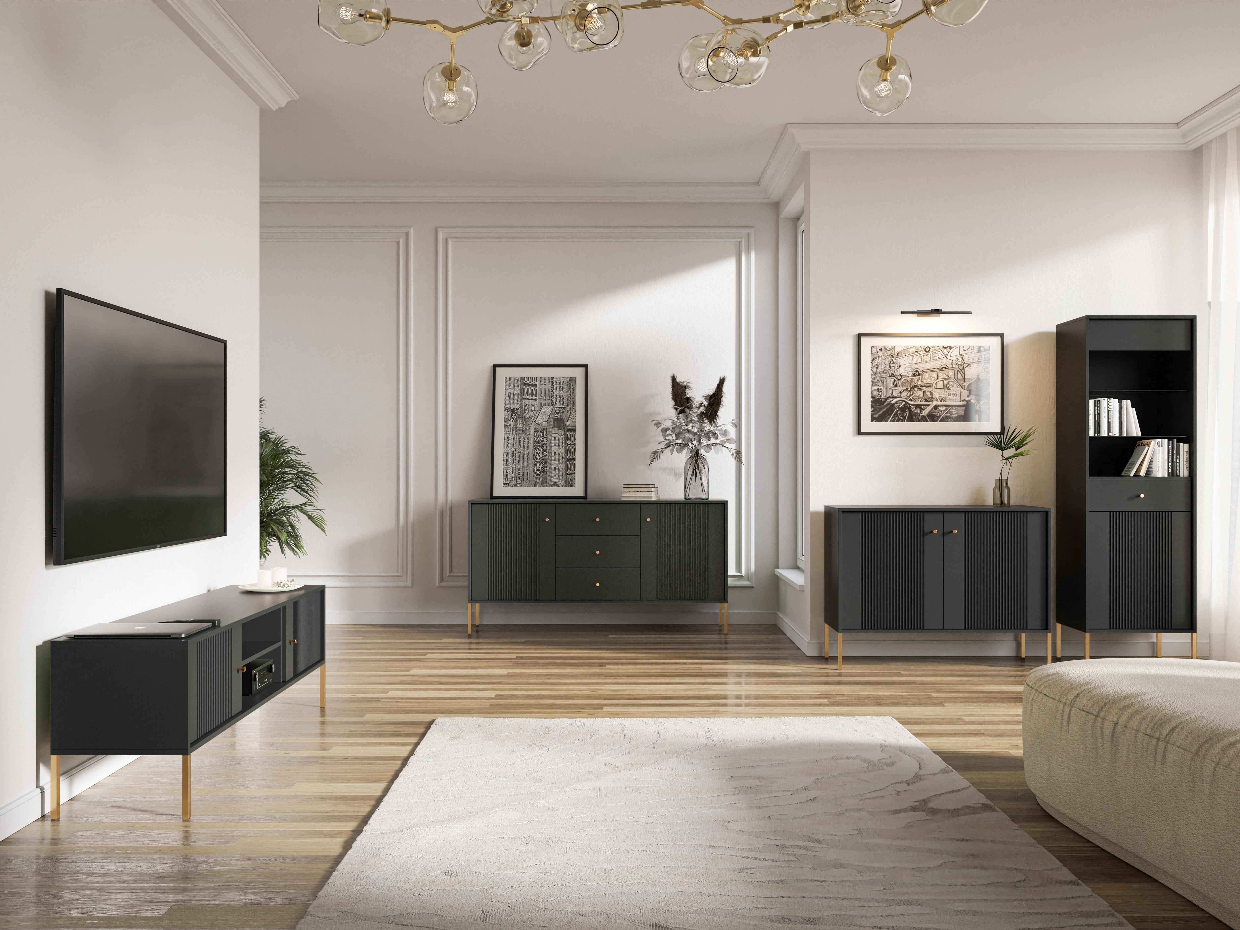 Améliorez votre rangement et votre style avec le buffet ISEO en noir et or. Ce grand buffet de 79x154x39 cm est fabriqué à partir de bois d'ingénierie et d'acier et présente une finition noire spectaculaire rehaussée d'or. Il comprend quatre étagères et trois tiroirs derrière deux portes à charnières, offrant une solution polyvalente pour tout organiser, des éléments multimédias aux essentiels de la salle à manger. Le design moderne et les accents opulents font de cette pièce un ajout luxueux à toute maison contemporaine.