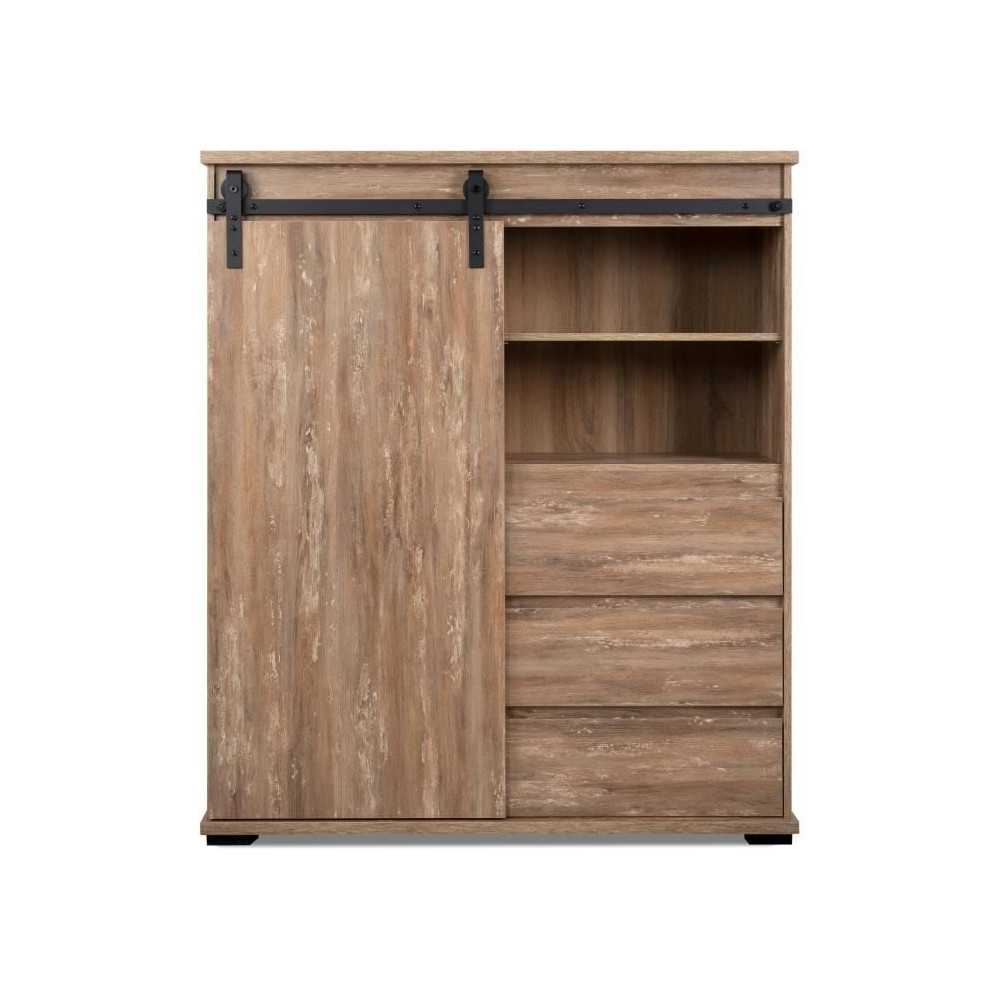 1 porte coulissante barn-style sur rail métallique noir mat, 3 tiroirs et 2 niches pour rangement et présentation.