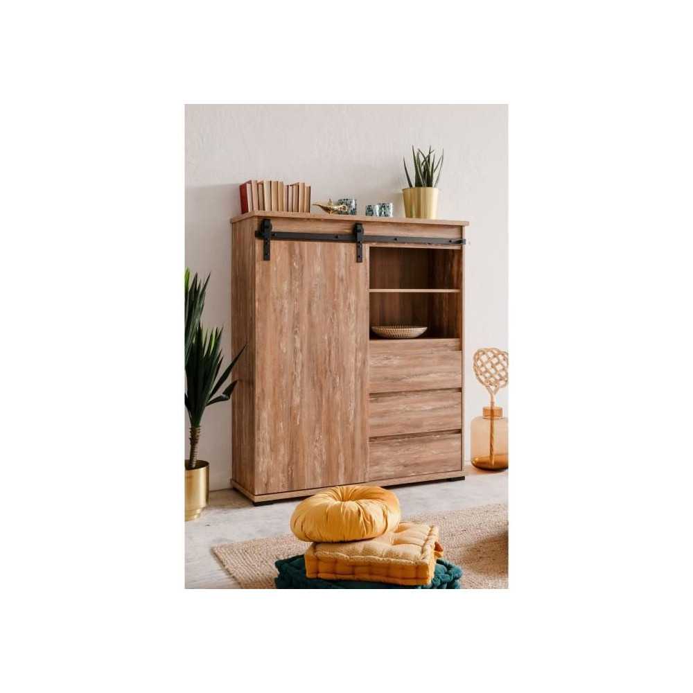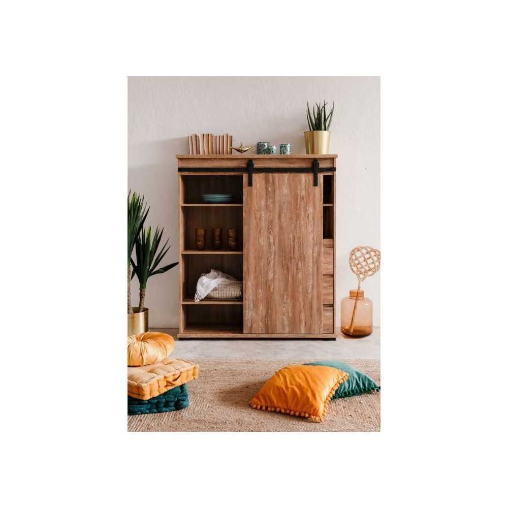 | Plus produit | Buffet haut style industriel-loft en panneaux de particules effet chêne. 1 porte coulissante barn-style, 3 tiroirs, 2 niches, étagères fixes, surface mate résistante, poignées intégrées en rainure, piétement surélevé avec petits pieds noirs. Fabriqué en Europe. |