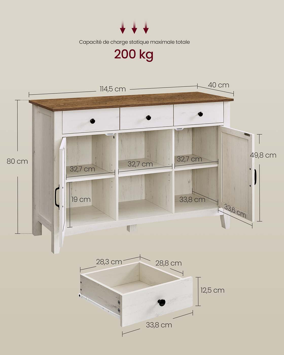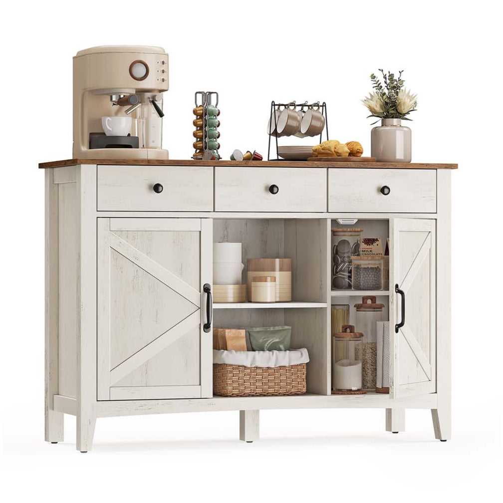 Avec son style campagne, ce buffet allie charme et fonctionnalité. Le contraste entre le blanc rustique et le marron miel, ainsi que ses portes de style ferme, en font un meuble à la fois chic et chaleureux. Il trouvera sa place aussi bien dans le salon, la cuisine que dans l’entrée en tant que console.
