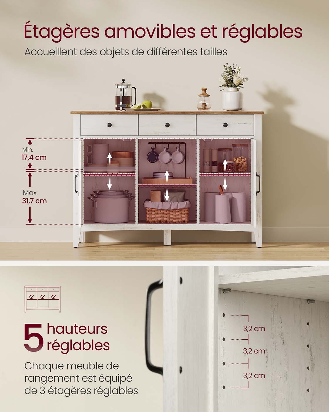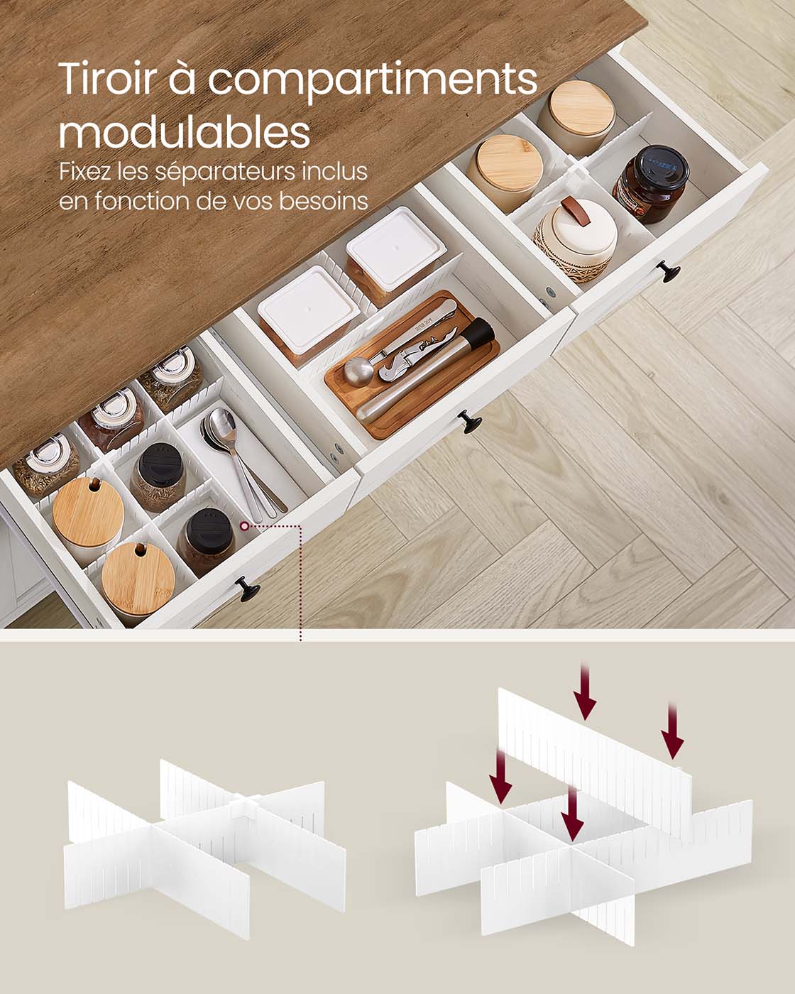 Sa conception réglable permet d’adapter l’espace selon vos besoins. Les tiroirs disposent de séparateurs ajustables, tandis que l’étagère du placard inférieur peut être positionnée sur 5 hauteurs différentes, idéale pour ranger des objets de tailles variées.