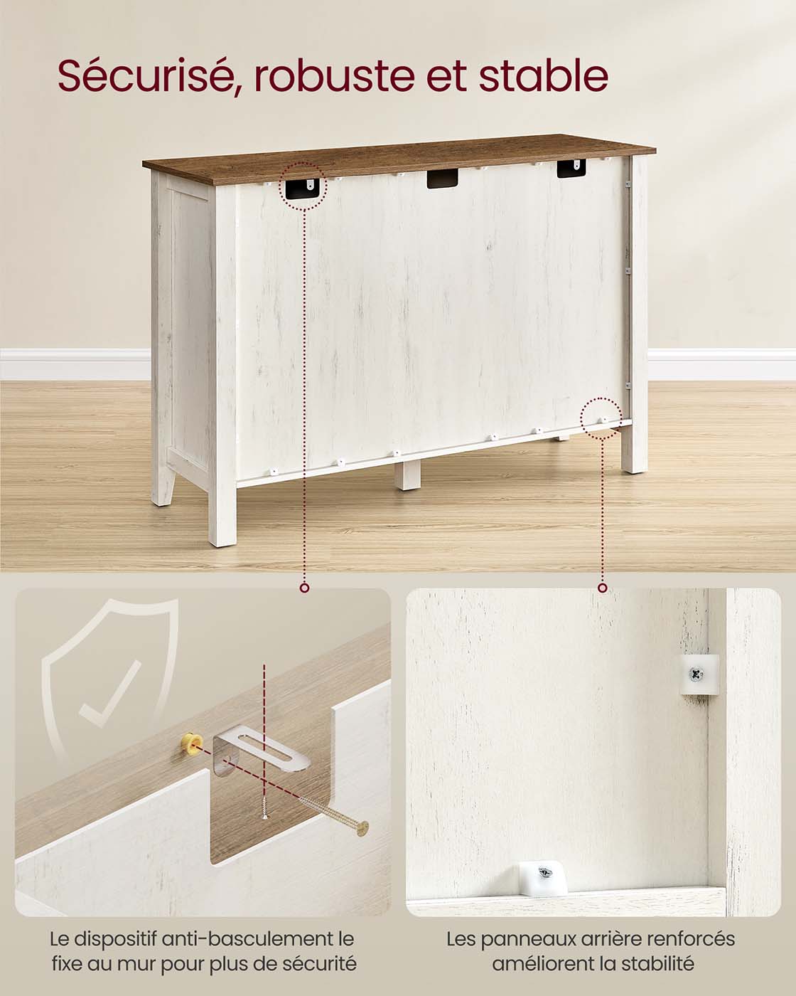 Fabriqué en panneaux MDF et agglomérés de qualité, il assure robustesse et durabilité. Pour plus de sécurité, un kit anti-basculement est inclus. Ses pieds hauts facilitent le nettoyage en dessous et des trous passe-câble sont prévus pour un usage plus pratique.