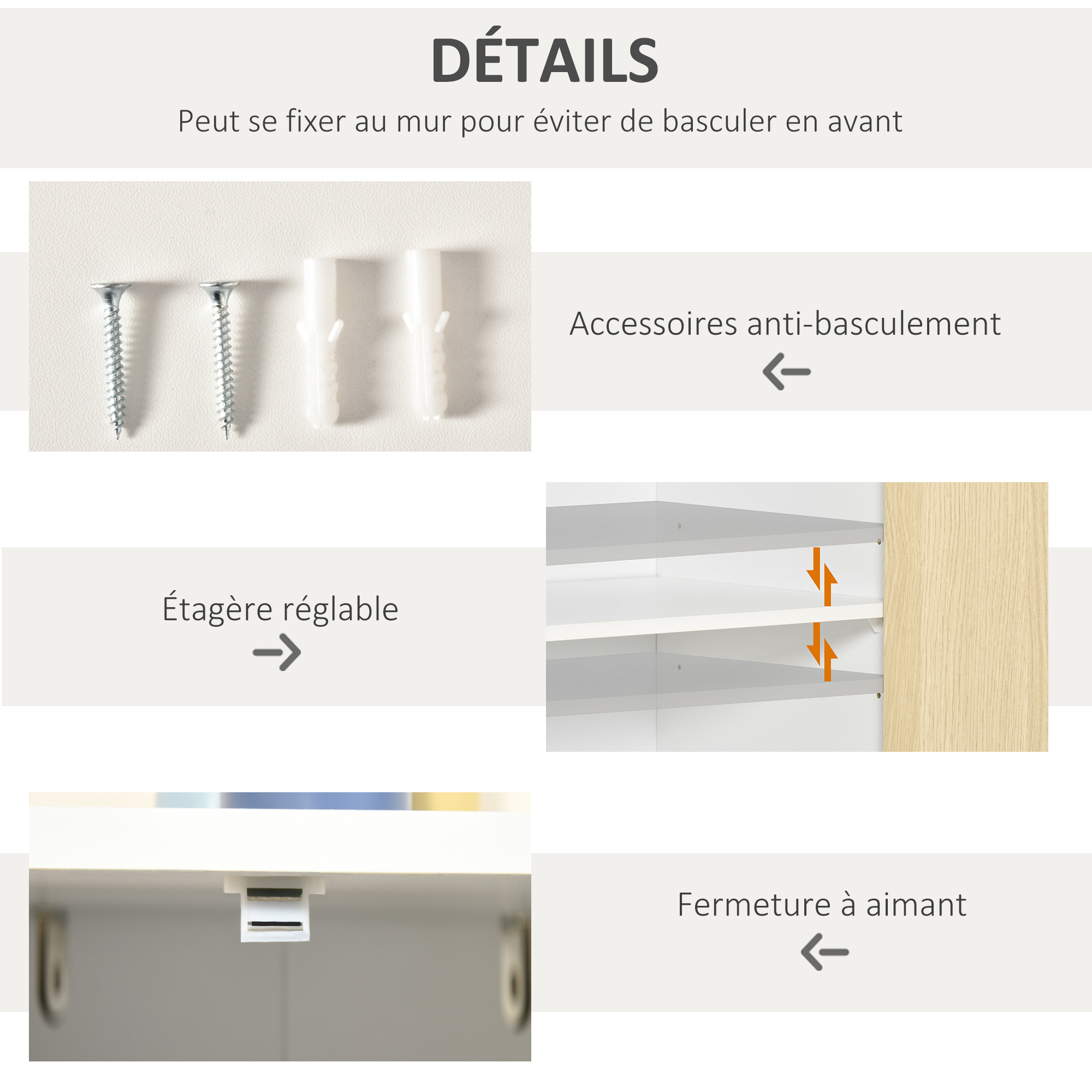 - Jolie finition : poignées de porte en alliage d'aluminium, portes avec loqueteaux magnétiques, piètement aspect bois clair doté de patins antidérapants, dispositif anti-basculement intégré