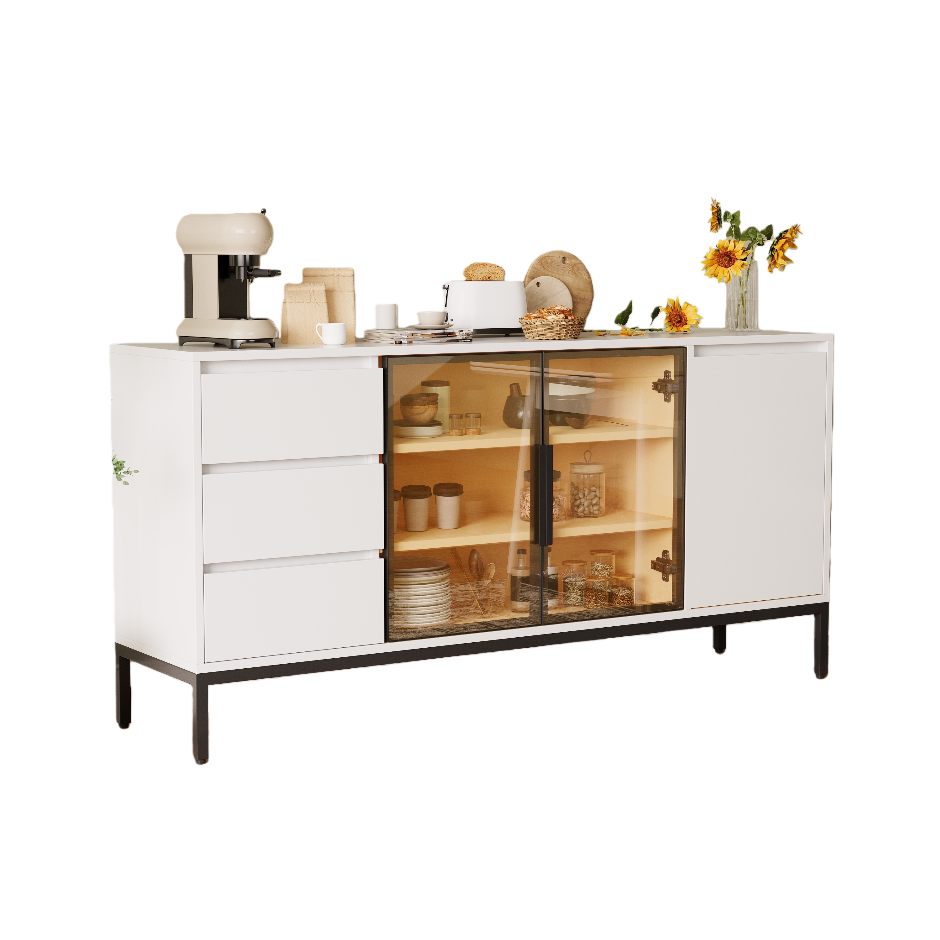 2. Ce charmant buffet est doté d'un plan de travail, de trois tiroirs et de deux compartiments de rangement à portes, offrant un espace de rangement généreux pour tous vos essentiels. Vous pouvez désormais tout ranger avec soin et y accéder facilement.