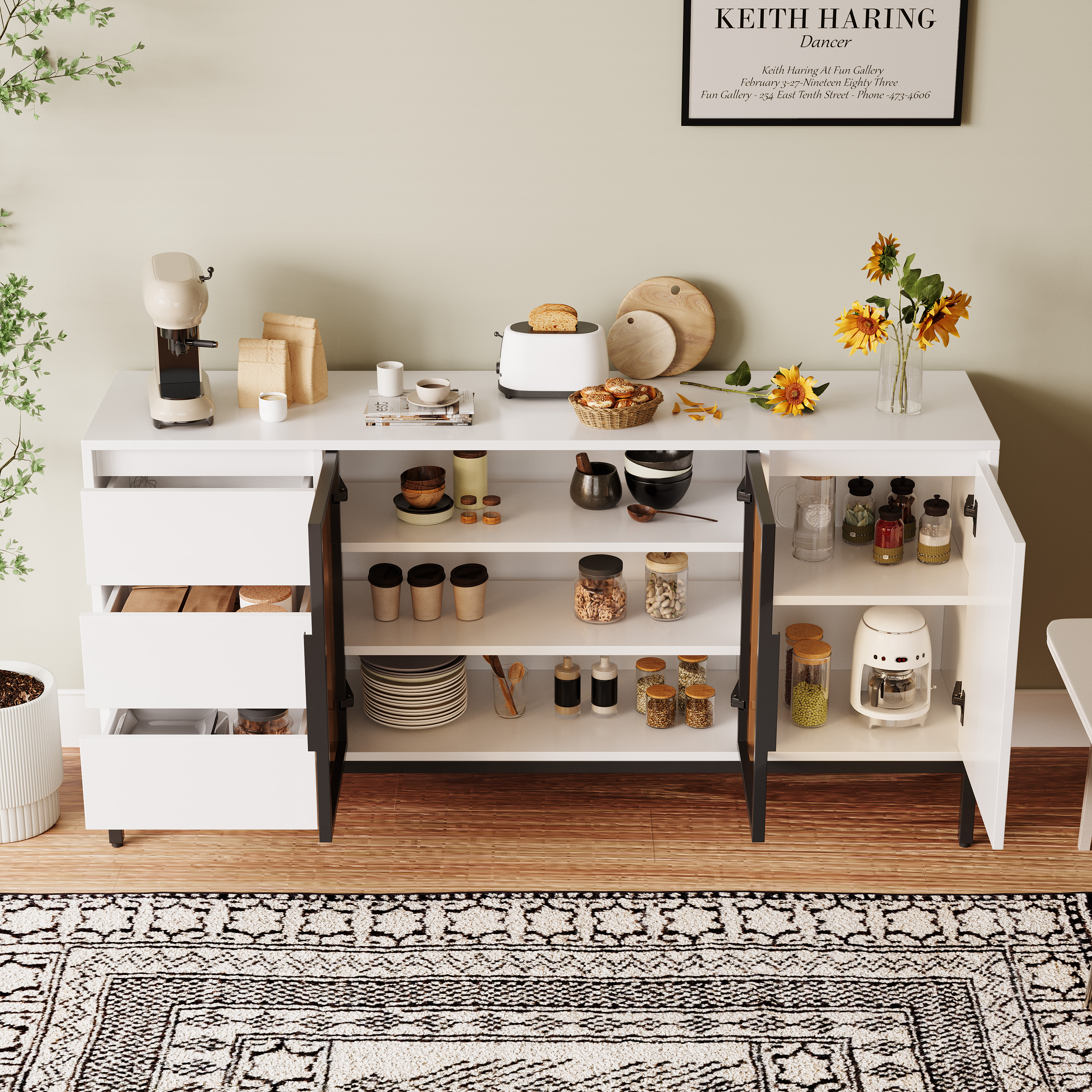 4. Son design simple et élégant, ainsi que sa couleur blanche neutre, font de notre buffet un meuble idéal pour toutes les pièces de votre maison. Polyvalent, il s'intègre à tous les styles de décoration tout en se distinguant par sa fonctionnalité unique.