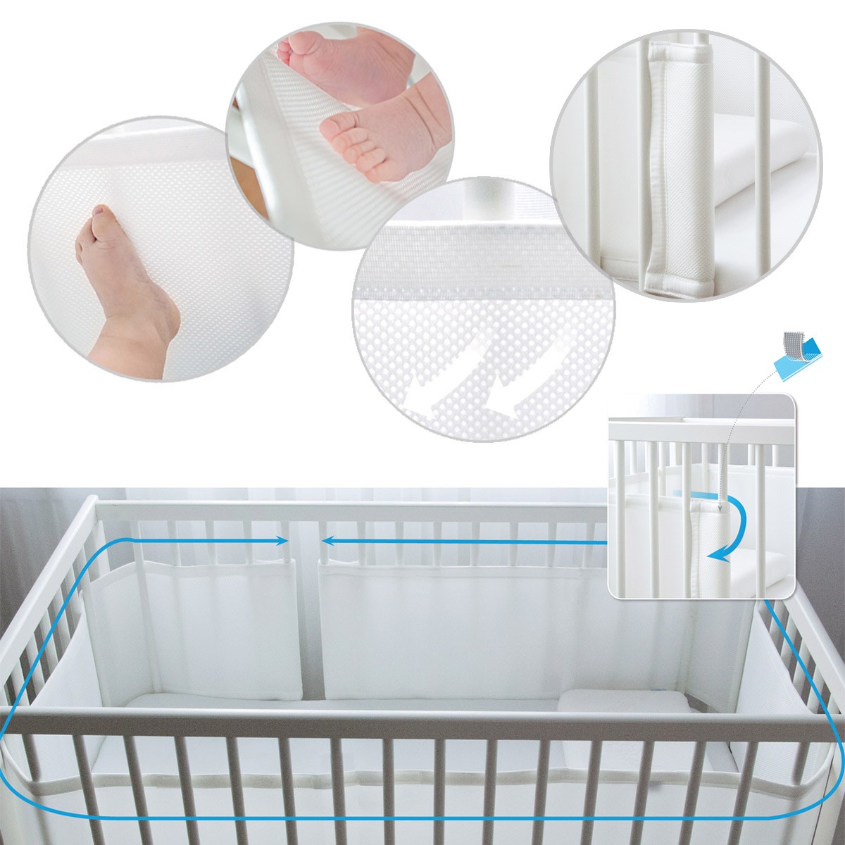 Ce tour de lit permet une meilleure circulation de l'air et réduit considérablement les risques d'étouffement. Il protège le bébé en évitant à l'enfant de se coincer les bras ou les jambes entre les barreaux. Son épaisseur évite à l'enfant de se cogner contre les barreaux ou les rebords du lit. Produit hypoallergénique. Fermeture Velcro.