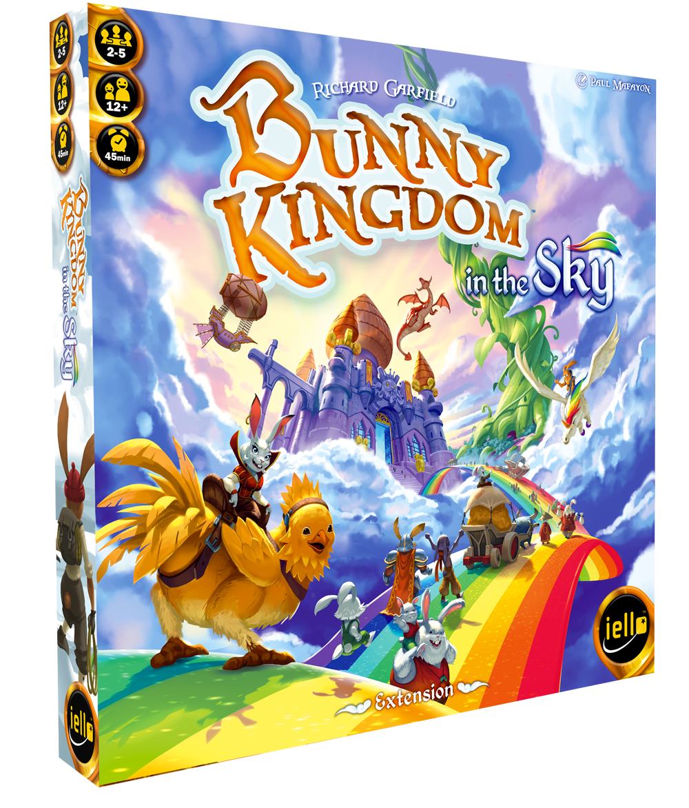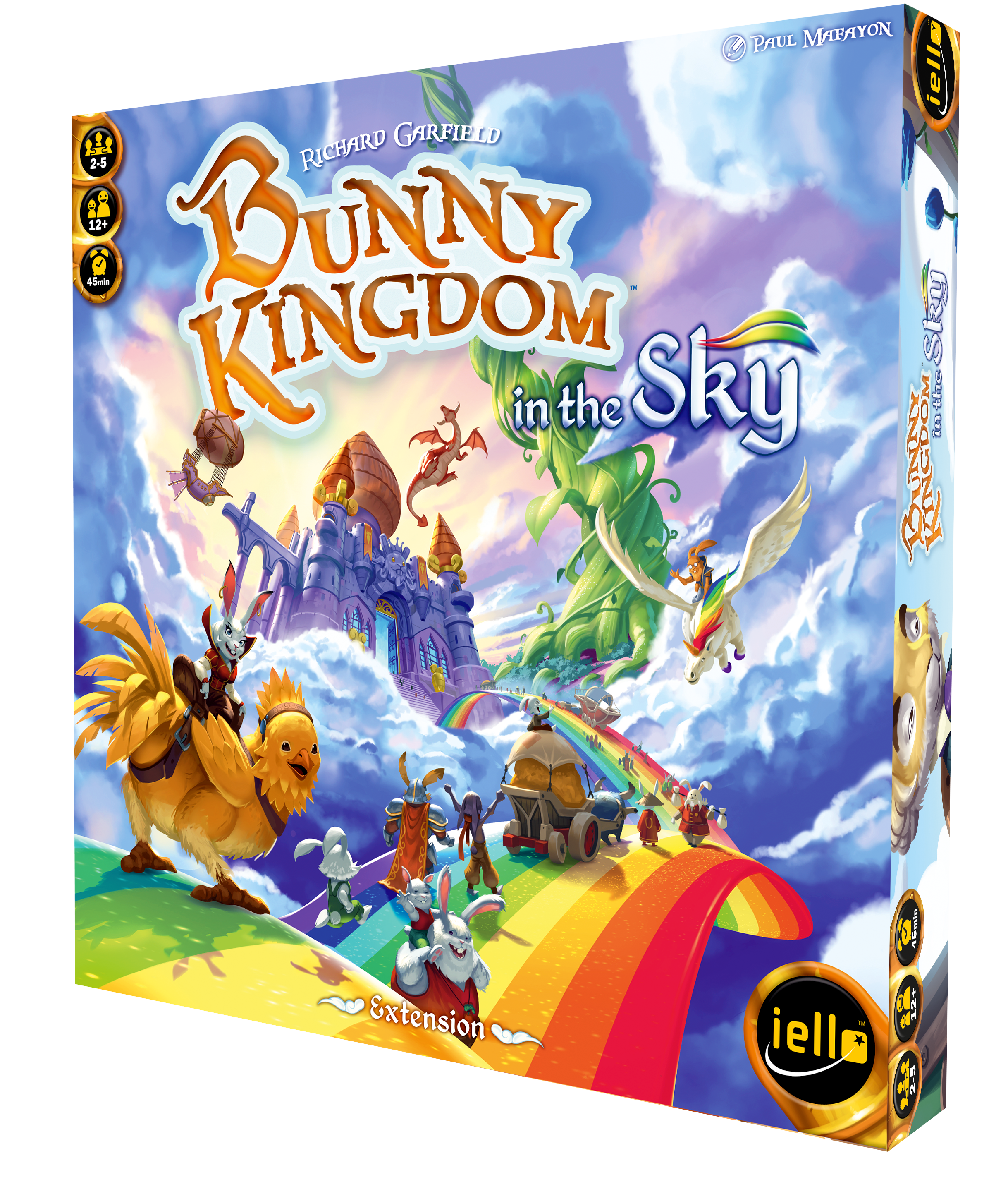 Depuis qu'un Grand Nuage étrange et mystérieux a été aperçu au-dessus du Nouveau Monde, tous les seigneurs Lapins tentent de s'y installer afin de rapporter au Roi Lapinot les Ressources merveilleuses qui s'y trouvent ... Toujours signé Richard Garfield et superbement illustré par Paul Mafayon, Bunny Kingdom In the Sky vous propose de découvrir un nouvel univers, perché sur un gigantesque nuage. Au programme : un tout nouveau plateau, à placer à côté de celui du jeu se base, mais aussi tout un tas de nouvelles ressources merveilleuses, un 5ème joueurs, de splendides carottadelles ou encore l'arrivée du commerce ! À vous de voir plus loin, plus grand et surtout… plus haut.