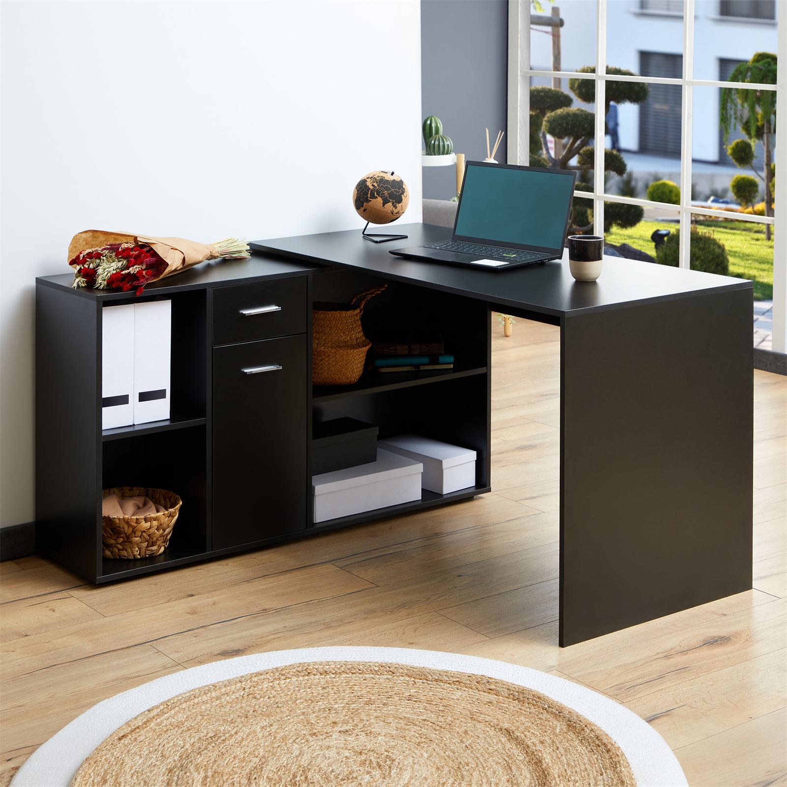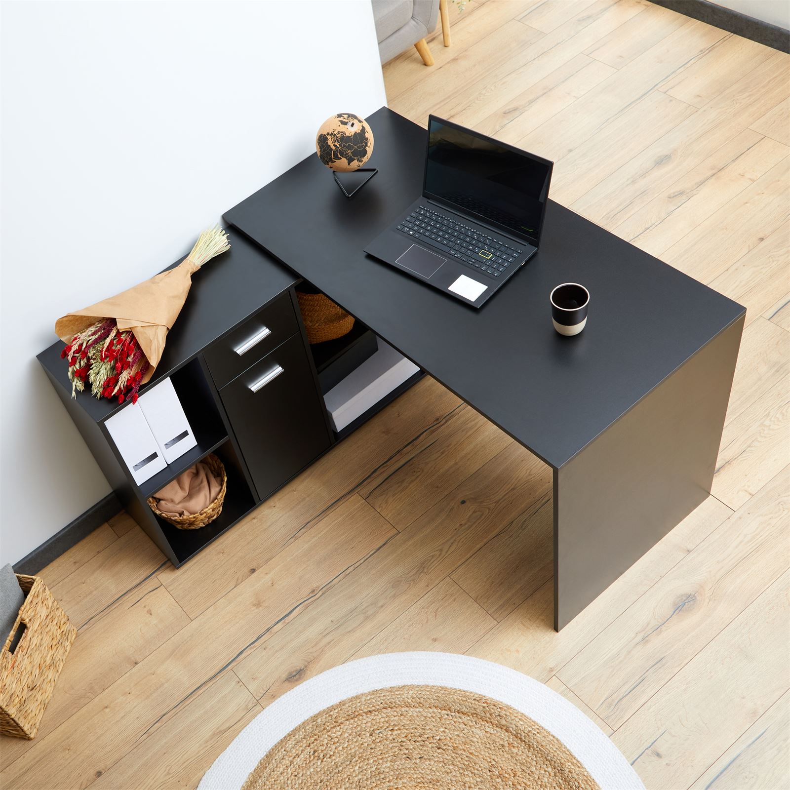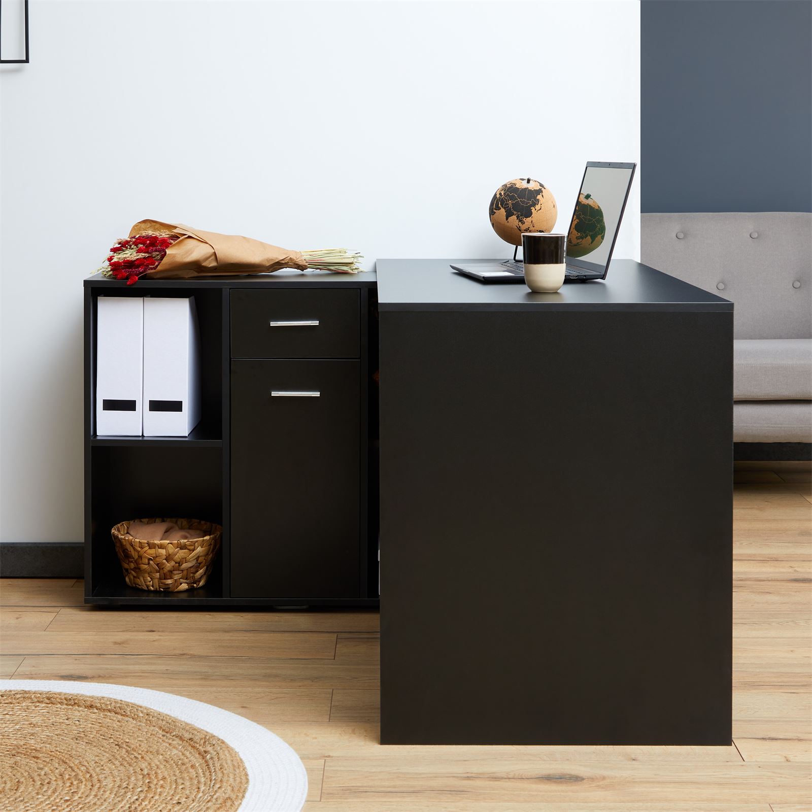 | Libellé | Bureau d'angle CARMEN bureau modulable avec meuble de rangement intégré 4 étagères 1 porte et 1 tiroir, décor noir mat |