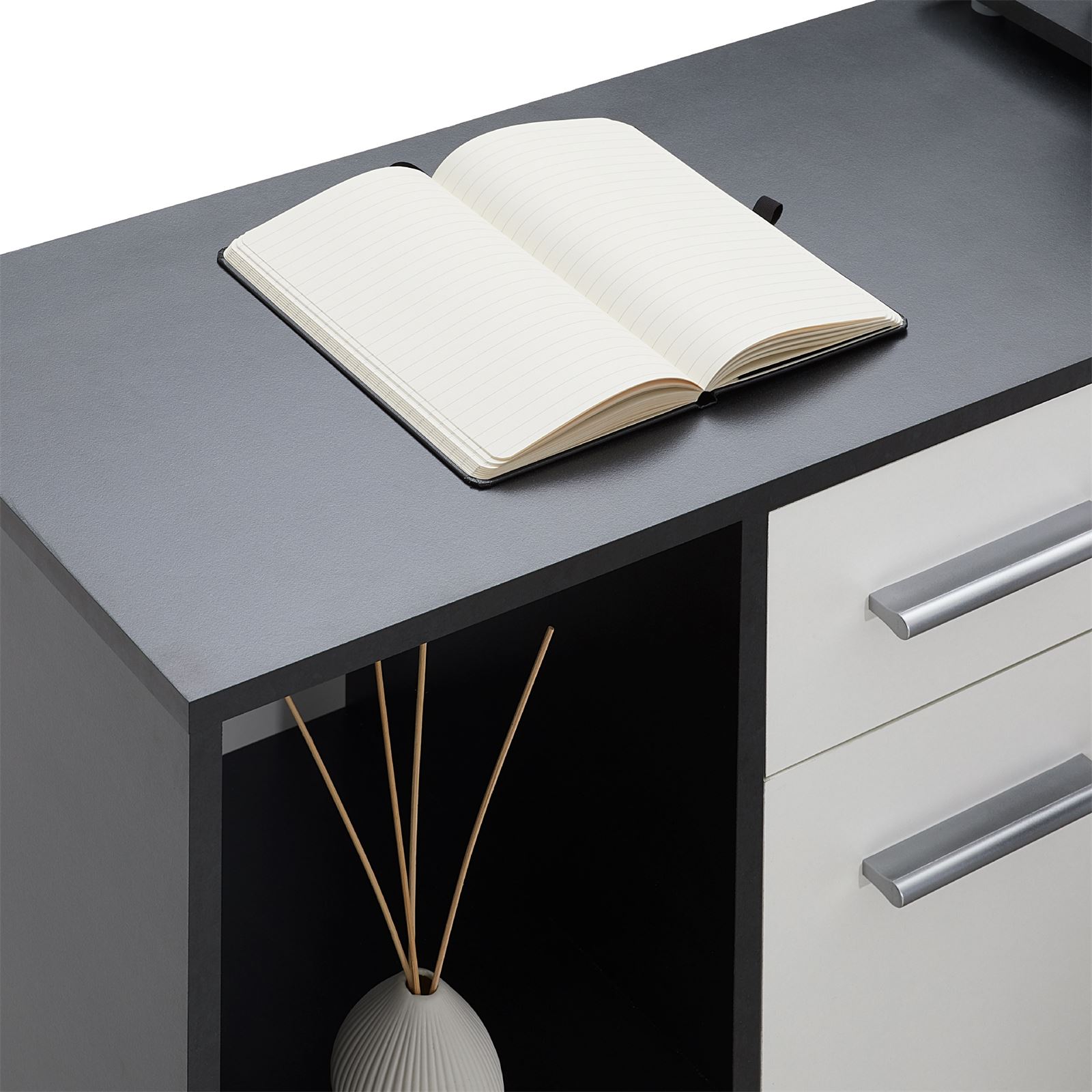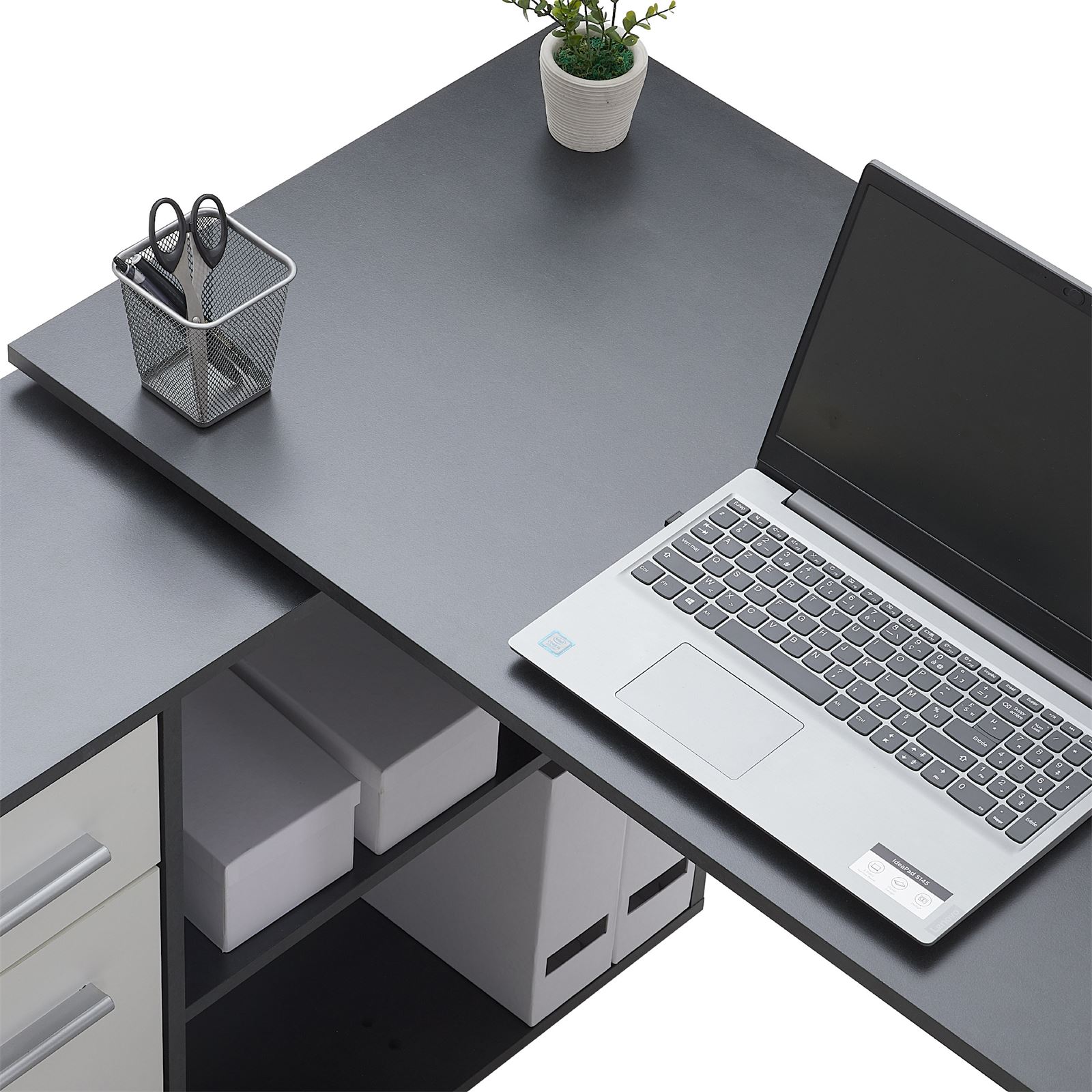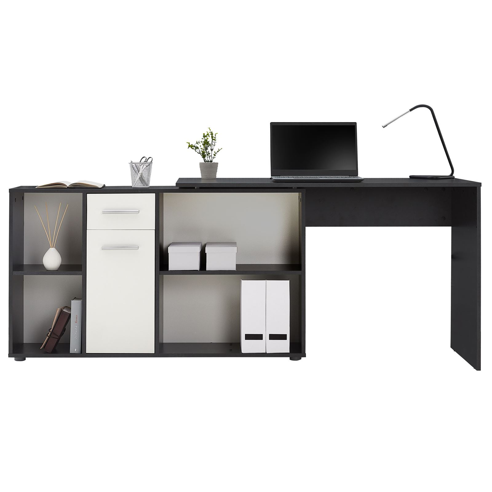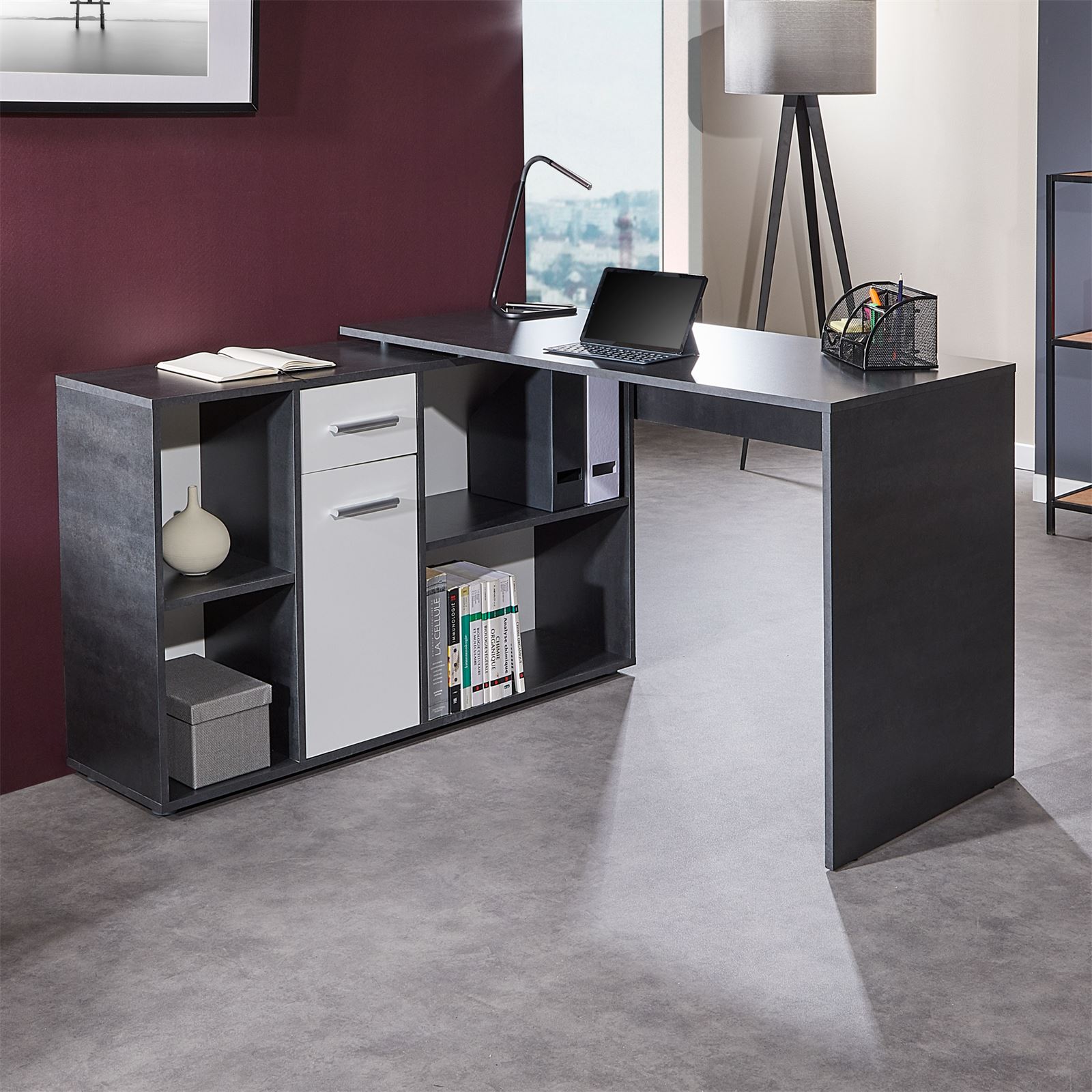 | Libellé | Bureau d'angle CARMEN table avec meuble de rangement intégré et modulable 4 étagères 1 porte et 1 tiroir, béton foncé/blanc |