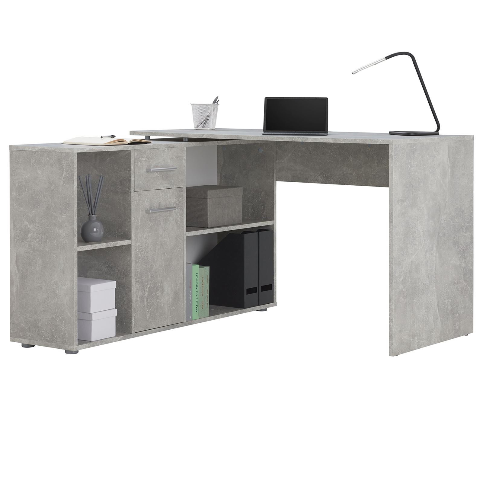 | Libellé | Bureau d'angle CARMEN table avec meuble de rangement intégré et modulable 4 étagères 1 porte et 1 tiroir, décor béton |