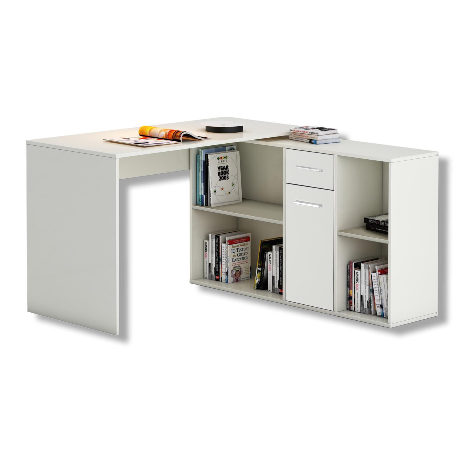 | Libellé | Bureau d'angle CARMEN table avec meuble de rangement intégré et modulable avec 4 étagères 1 porte et 1 tiroir, décor blanc mat |