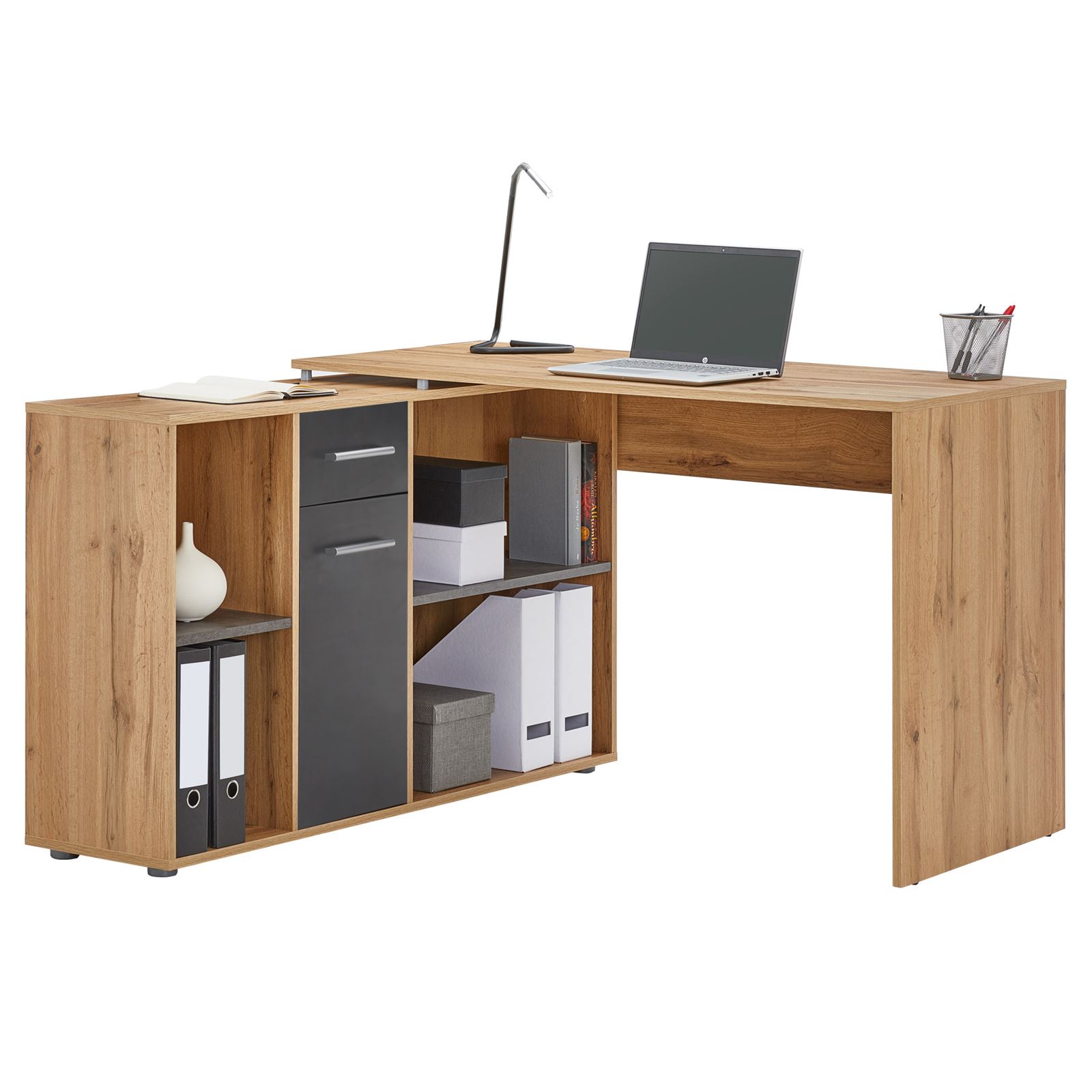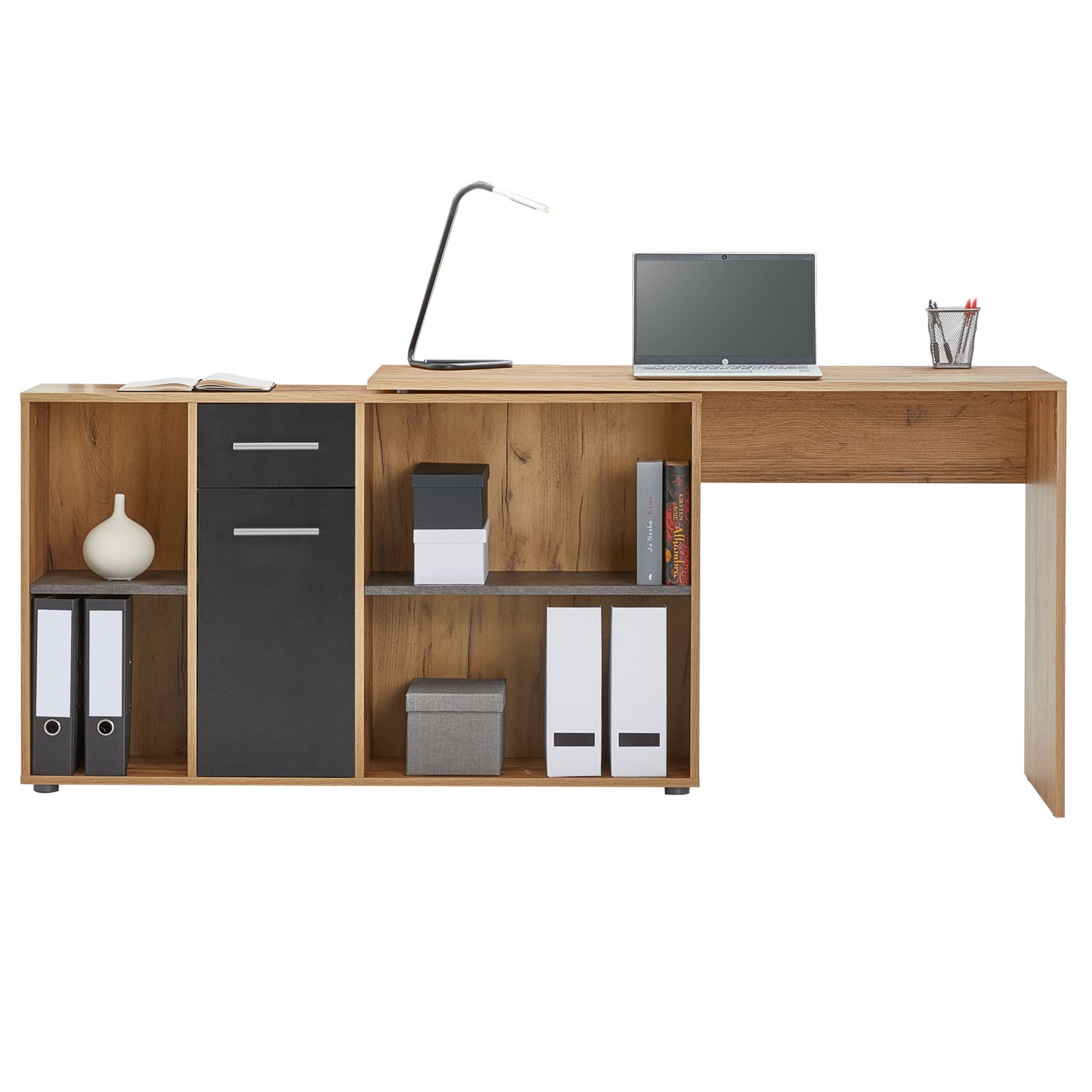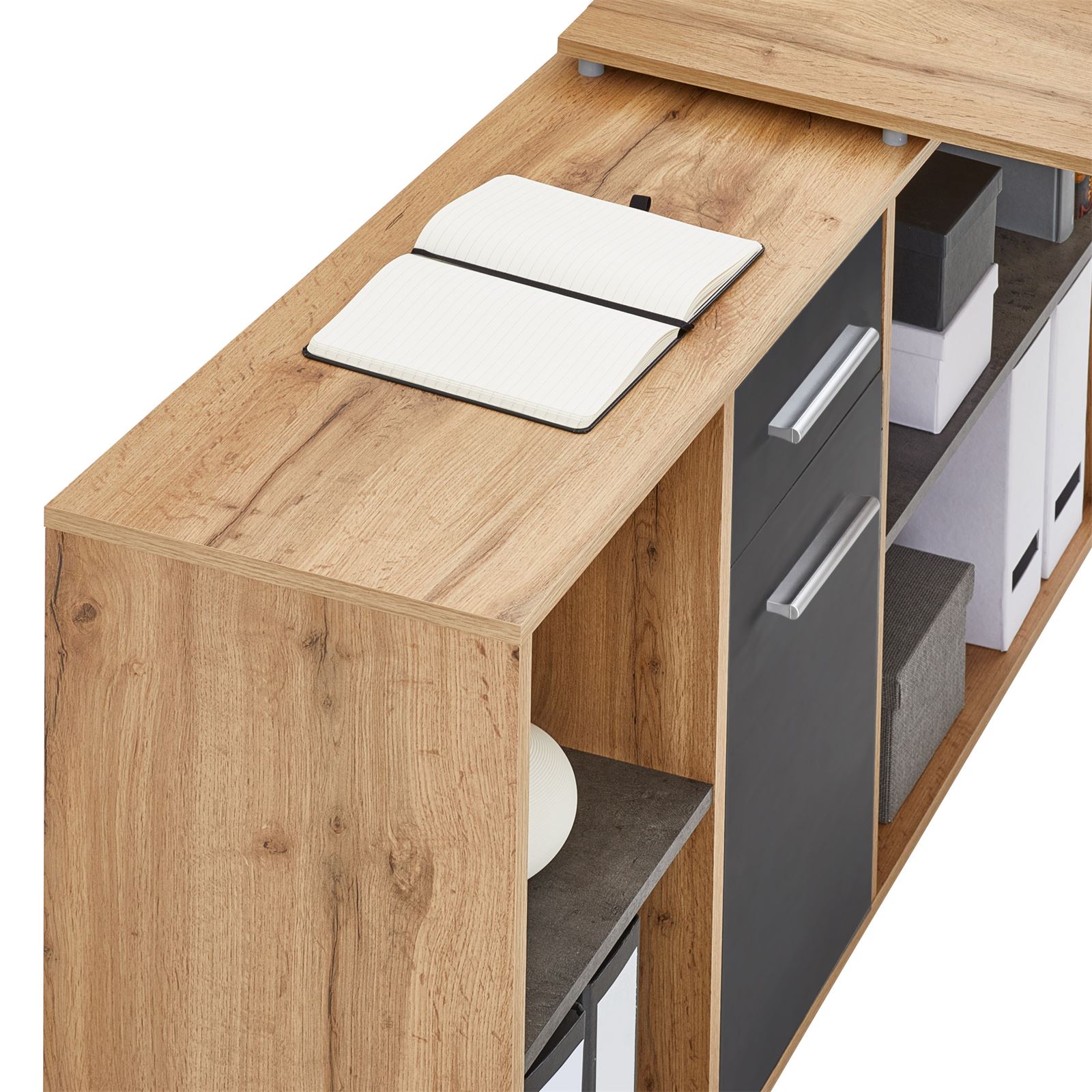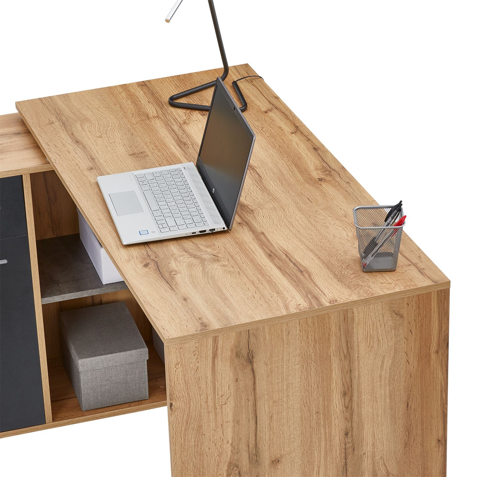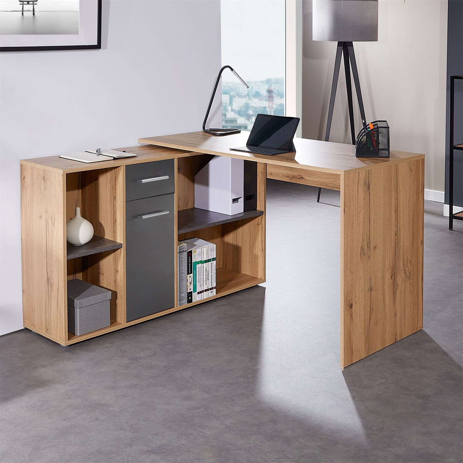 | Libellé | Bureau d'angle CARMEN table meuble de rangement intégré et modulable 4 étagères 1 porte et 1 tiroir, décor chêne sauvage/béton foncé |