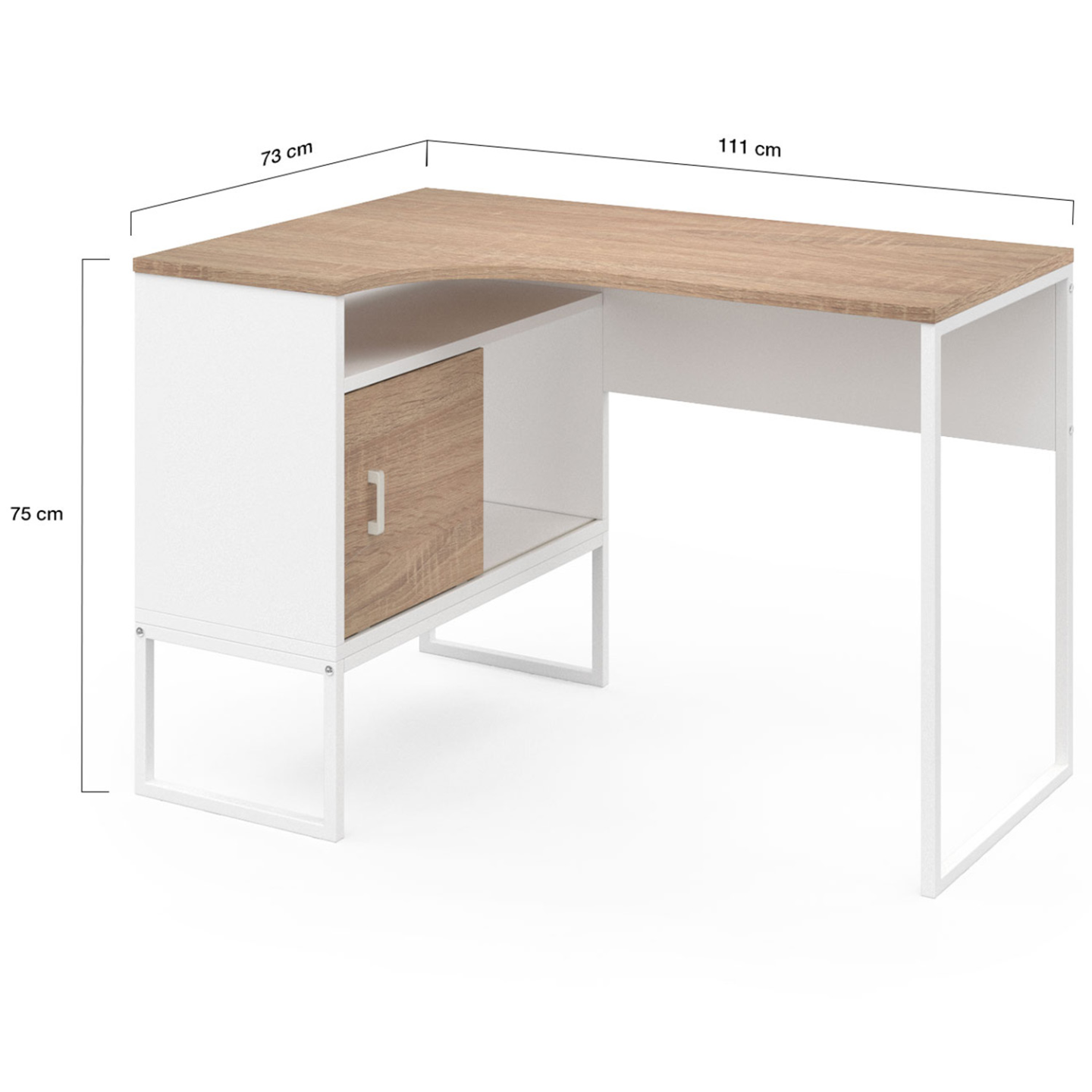 Equipez-vous du bureau d'angle ROB, parfait pour travailler grâce à son large plateau arrondi ! Son long plateau de 111 x 73 cm vous permettra d'installer poste d'ordinateur, imprimante et accessoires de bureau, tout en disposant d'assez d'espace pour travailler !Pratique et fonctionnel, le bureau est équipé d'une partie rangement composée d'une niche de stockage de 73 x 33 x 12 cm ainsi que d'une étagère avec porte coulissante de 73 x 33 x 33.5 cm ! Organisez vos papiers et vos classeurs selon vos envies dans ces deux espaces distincts. Gardez ainsi l'ensemble de vos affaires à portée de main !Avec son plan de travail en L, sa structure en bi-matière métal et PB et son espace de stockage, vous disposez de tous les ingrédients pour un espace de travail optimisé et pratique.Son design industriel moderne et ses lignes épurées lui confèrent un look des plus tendance ! Sa structure bi-matière bois et métal, en plus d'être stable et robuste, se mariera à merveille avec tous les styles d'intérieurs !Il ne vous reste plus qu'à installer vos affaires avec une petite touche de décoration et vous voilà prêt pour travailler ! Dimensions du bureau d'angle ROB blanc et façon hêtreDimensions globales : Longueur 111 x largeur 73 x Hauteur 75 cmDimensions niche latérale : L.73 x l.33 x H.12 cmDimensions étagère avec porte coulissante : L.73 x l.33 x H.33.5 cmHauteur du pied latéral : L.25 cmMatériaux : panneaux de particules 15mm et métal 2x2 cmColoris : blanc et façon hêtre À monter soi-mêmeRetrouvez l'ensemble de nos bureaux sur notre boutique en ligne !