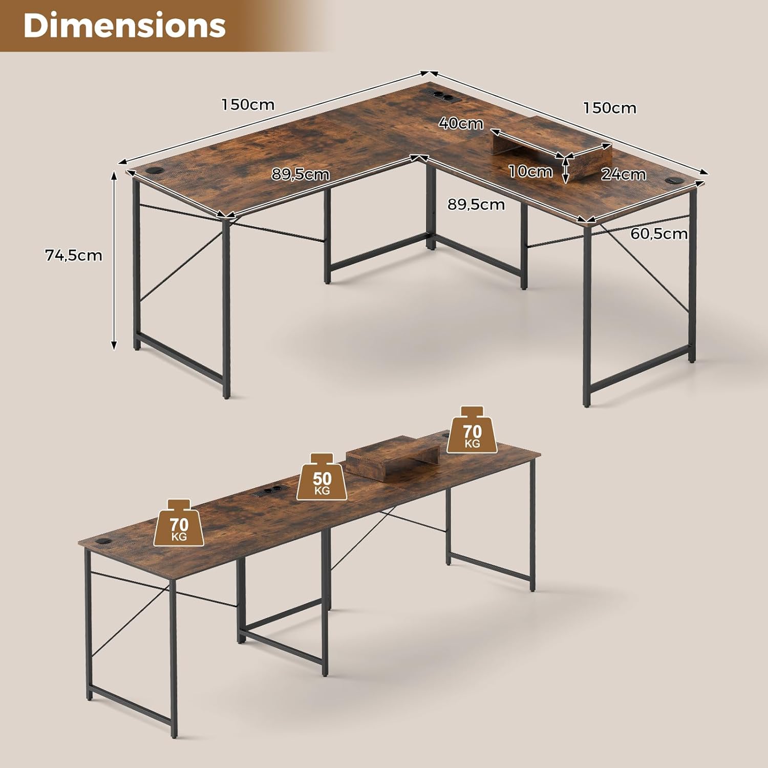 - 2 Configurations de Bureau - Pour répondre à vos besoins, vous pouvez utiliser ce bureau soit comme bureau en L compact (150 x 150 x 74 cm), soit le transformer en un bureau long (240 x 60 x 74 cm), offrant ainsi une grande surface de travail dans les deux configurations pour tous vos équipements de bureau.