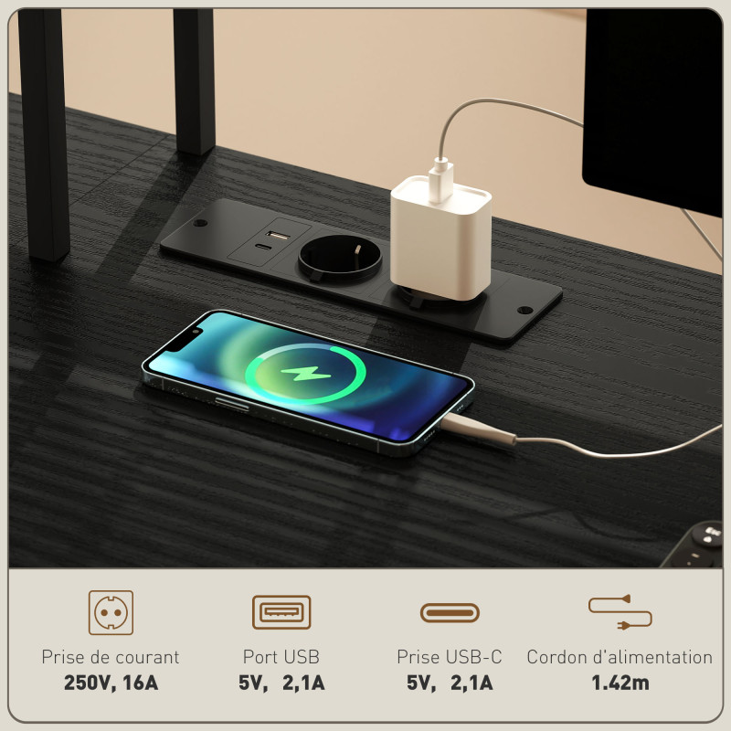 Malin et pratique, le bureau dangle Bossy de MYCOCOONING sadapte à vos envies ou à la pièce où vous souhaitez linstaller. Modulable, il peut être utilisé en L ou installé tout en longueur, droit sur 240 cm. Les plateaux sont en panneaux de particules de bois recouverts de mélaminé noir, un matériau facile à nettoyer, qui ne raye pas et qui ne tache pas. Les panneaux sont fixés sur un cadre métallique peint, solide et robuste. Les patins des pieds sont réglables afin daméliorer la stabilité. Ce magnifique bureau dangle est doté dune station de charge avec prise, port-USB et USB-C, pour recharger vos appareils connectés. Il possède de nombreux rangements et solutions pour conserver un espace ordonné : un plateau coulissant pour clavier, des compartiments et une étagère pour entreposer votre unité centrale dordinateur. Un sac de rangement latéral permet de garder vos petites fournitures de bureau à portée de main. Caractéristiques : - Bureau d'angle avec rangement comprend une prise électrique, un port USB et une prise USB-C - Le bureau de chambre se transforme en table en forme de L ou en table longue pour plus de polyvalence - Le plateau coulissant pour clavier, les compartiments du hutch et l'étagère CPU augmentent l'organisation - Le sac de rangement latéral permet de garder les petits articles de bureau à portée de main - Le panneau de particules revêtu de mélamine assure un nettoyage facile - Bureau d'angle modulable à cadre métallique peint est solide et robuste - Les patins de pieds réglables améliorent la stabilité - Montage nécessaire Spécifications : - Couleur : noir - Matériaux : panneau de particules, métal - Dim. totales : 160L x 120l x 145H cm (bureau en L), 240L x 40l x 145H cm (grand bureau) - Dim. chaque plateau : 120L x 40l x 73,5H cm - Dim. espace pour les genoux : 91l x 71,5H cm - Dim. plateau pour clavier : 50l x 28P x 10H cm - Dim. sac de rangement : 38l x 22,5P x 6H cm - Dim. étagère inférieure : 24l x 37,9P x 63H cm - Dim. chaque compartiment : 36,6l x 15P x 15,4H cm - Longueur du câble : 1,42 m - Classé : AC 250V/50Hz, 16A - Puissance max. : 3680W - USB/Type C : DC 5V, 2,1A - Charge max. recommandée : 125 kg (total), 50 kg (chaque plateau), 5 kg (étagère)