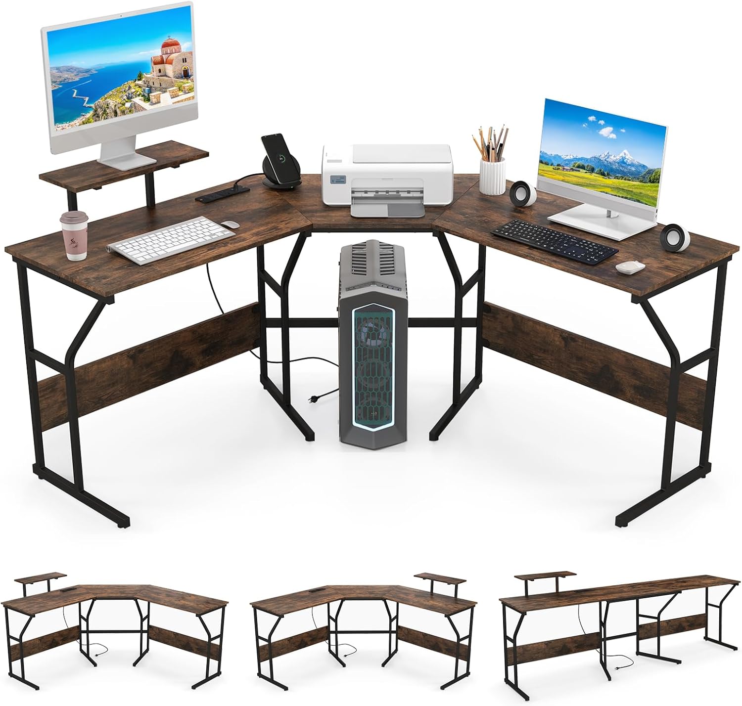Bureau d'angle transformable en forme de L,avec ports de charge et prises, bureau avec étagère marron