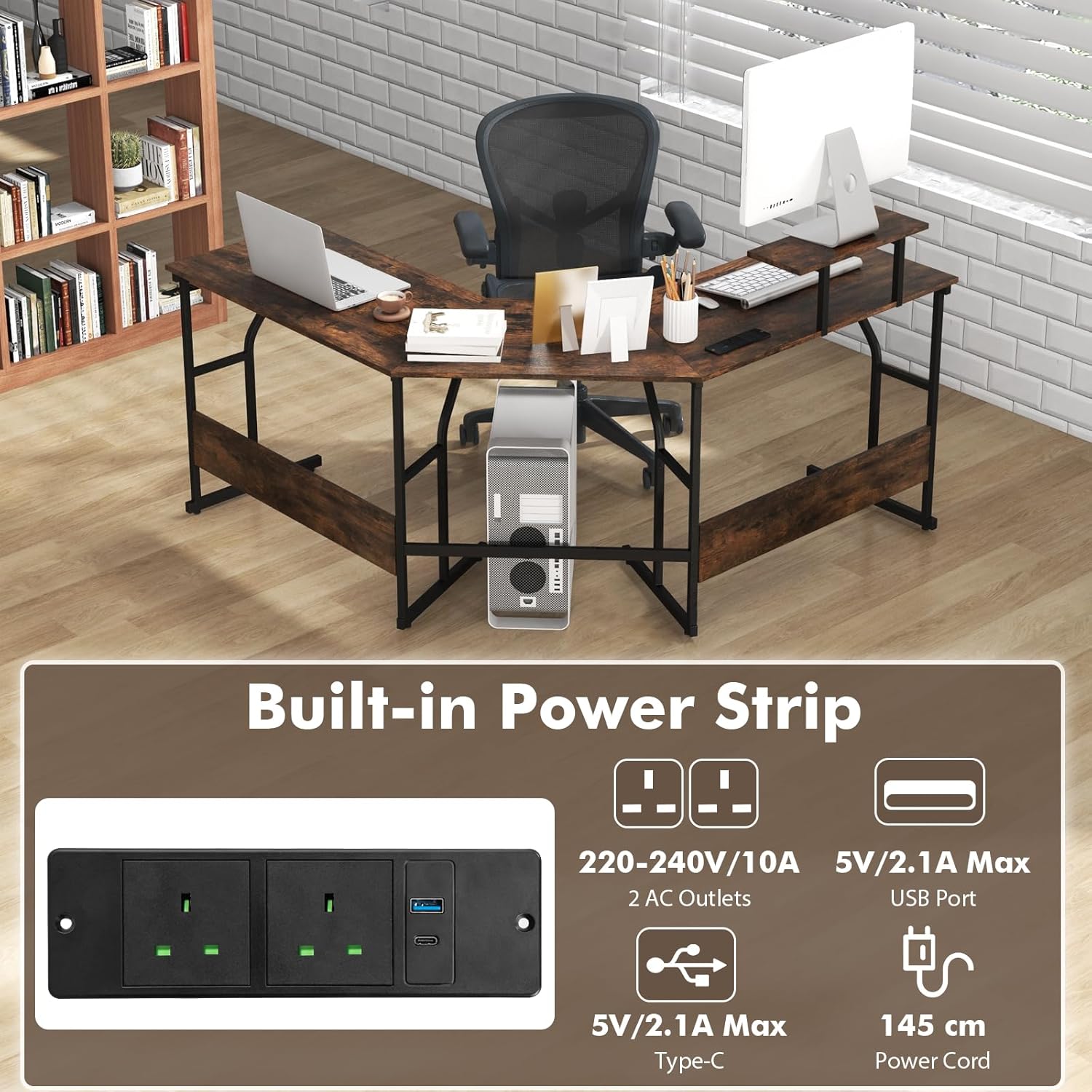 | Libellé | Bureau d'angle transformable en forme de L,avec ports de charge et prises, bureau avec étagère marron |