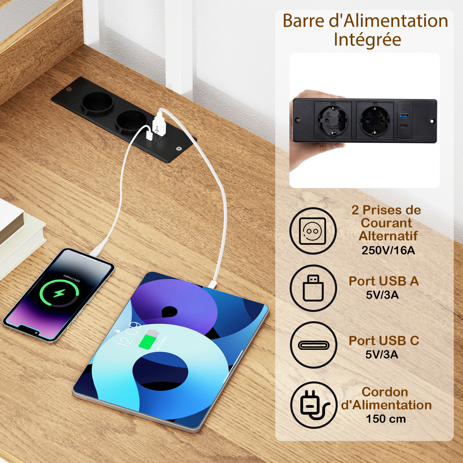 Bureau d'Ordinateur avec Multiprise, Table d'Étude 120 cm avec Bibliothèque, Port USB A, Port Type-C, Pos