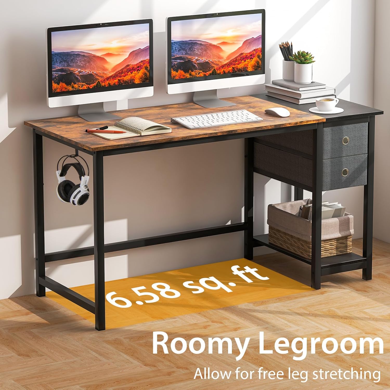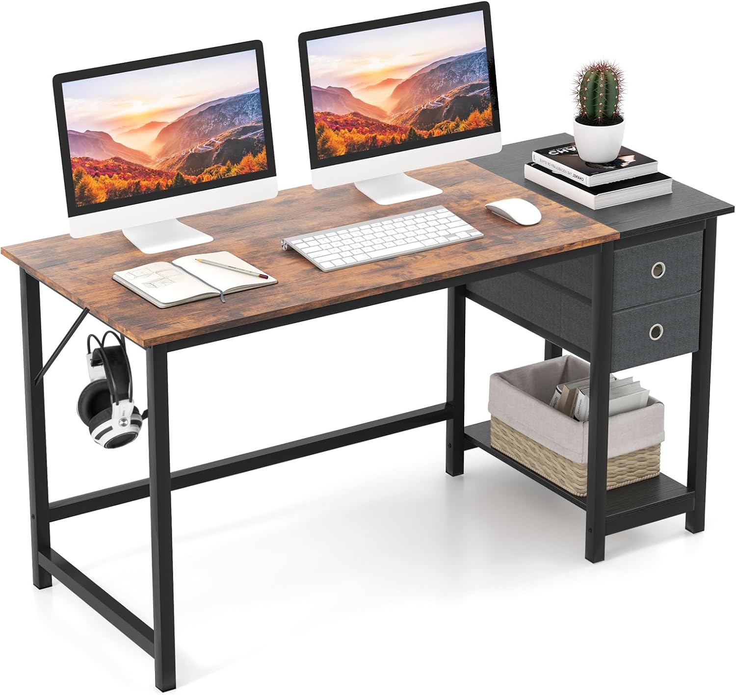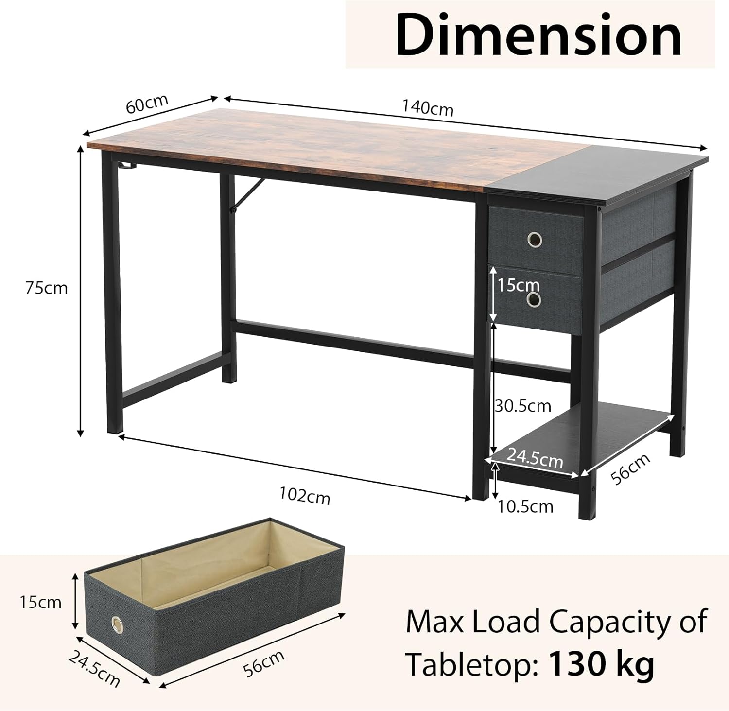 Ce bureau d'ordinateur offre un large espace de travail avec un plateau de 120 cm / 140 cm, tout en vous permettant de rester organisé avec le crochet pour casque et les 2 tiroirs amovibles. Pour plus de flexibilité dans l'agencement de l'espace, le bureau de bureau à domicile est également doté d'une étagère ouverte multifonctionnelle qui peut être transformée en support pratique pour hôte lorsque les tiroirs sont retirés. Avec sa construction métallique stable, il peut supporter une capacité de charge substantielle de 130 kg, tandis que des patins de protection évitent les rayures sur le sol. Que ce soit dans votre salon, votre chambre, votre bureau ou votre bureau, ce bureau d'étude est le partenaire de travail parfait.
