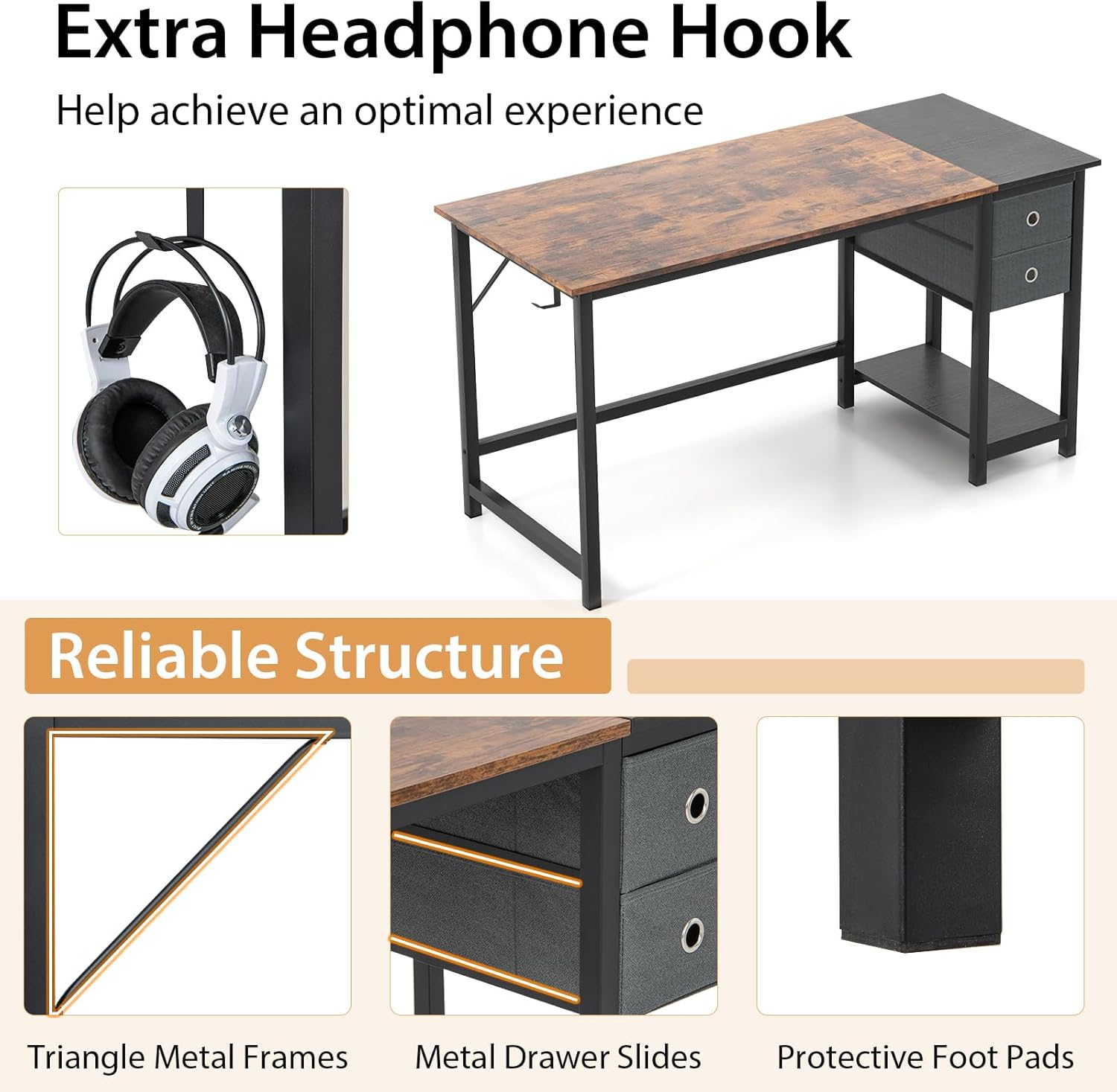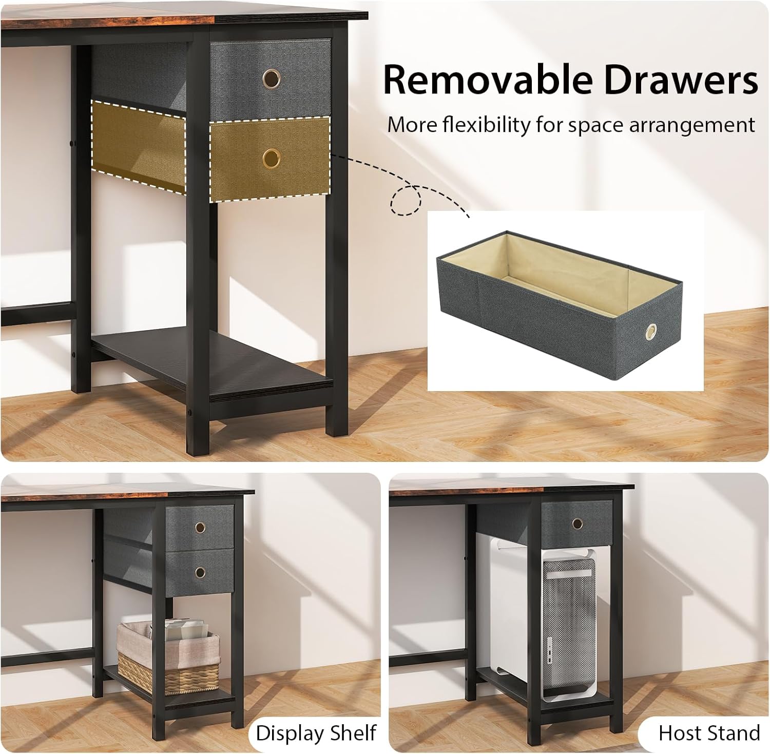 - 𝐓𝐢𝐫𝐨𝐢𝐫𝐬 𝐞𝐭 𝐂𝐫𝐨𝐜𝐡𝐞𝐭𝐬 # Les crochets situés sur le côté du bureau peuvent être utilisés pour suspendre des écouteurs ou des sacs. De plus, ses 2 tiroirs sont amovibles, ce qui laisse de la place pour des objets volumineux tels qu'une unité centrale d'ordinateur.