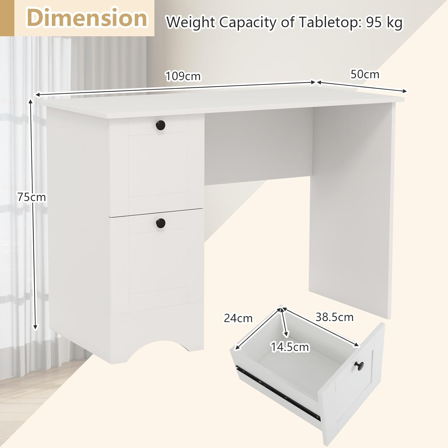 Mesurant 109 x 50 x 75 cm, ce bureau spacieux avec une grande surface vous permet de placer confortablement votre ordinateur, vos livres et tous vos essentiels, tout en offrant un espace sous le bureau pour étirer vos jambes et travailler en tout confort. Avec deux tiroirs coulissants, gardez vos effets personnels organisés et à portée de main. Fabriqué avec des matériaux de haute qualité, il supporte jusqu'à 105 kg au total et est équipé de pieds antidérapants pour protéger votre sol.