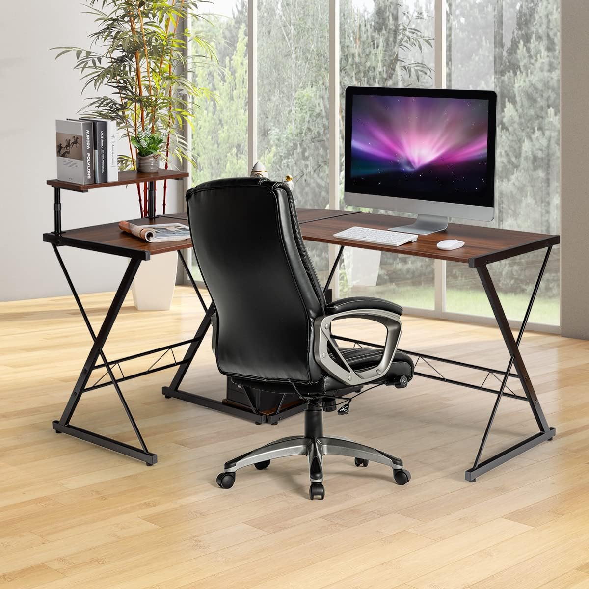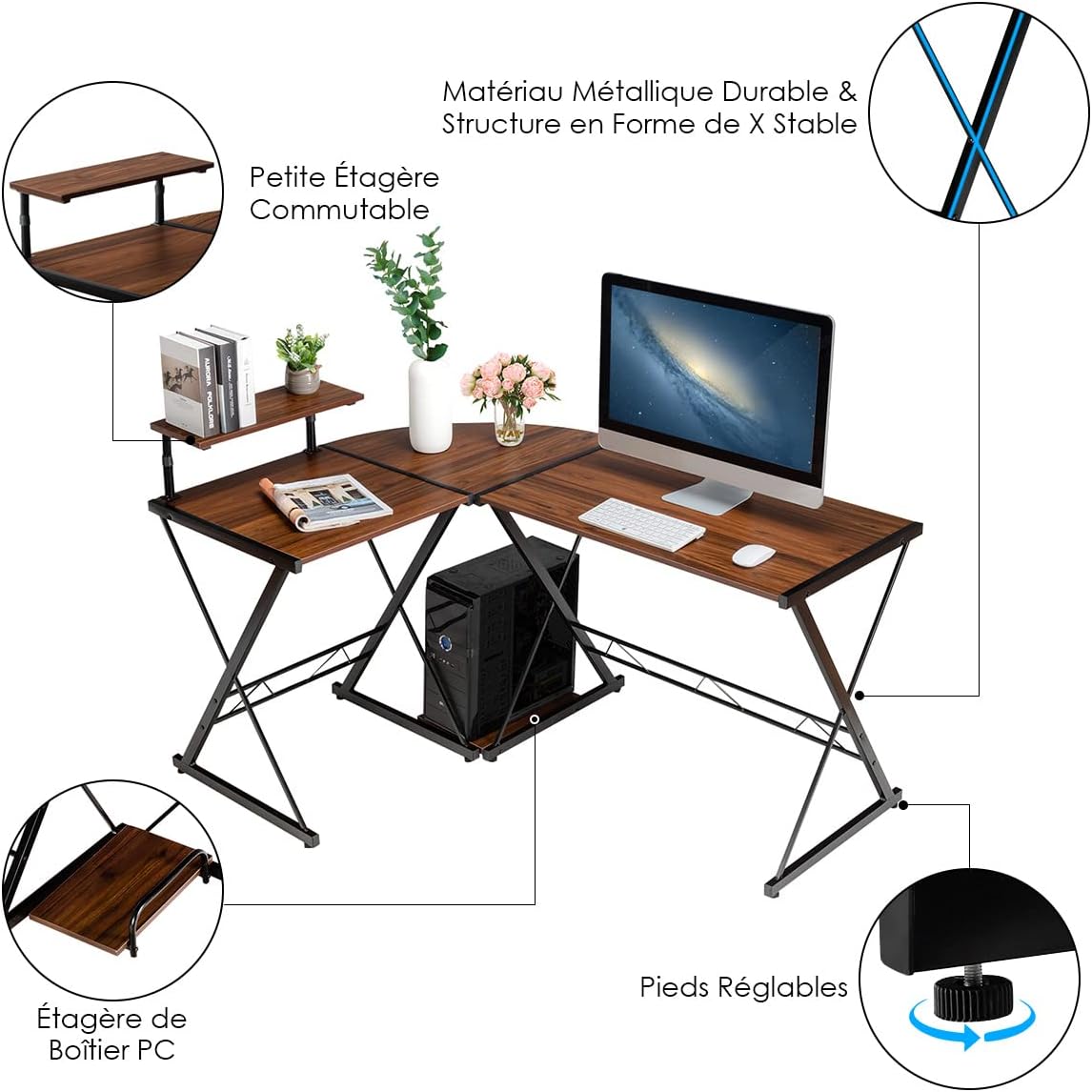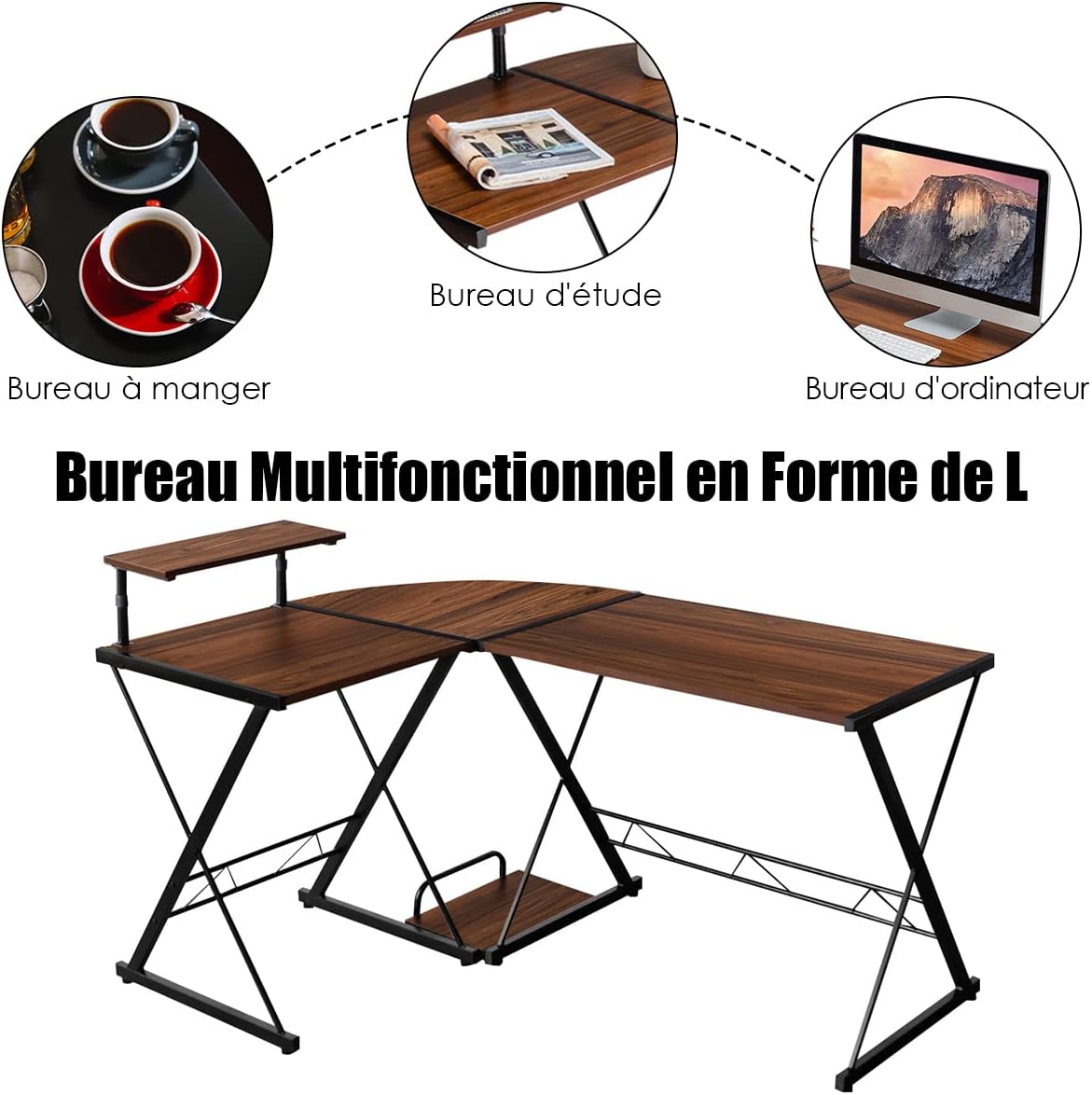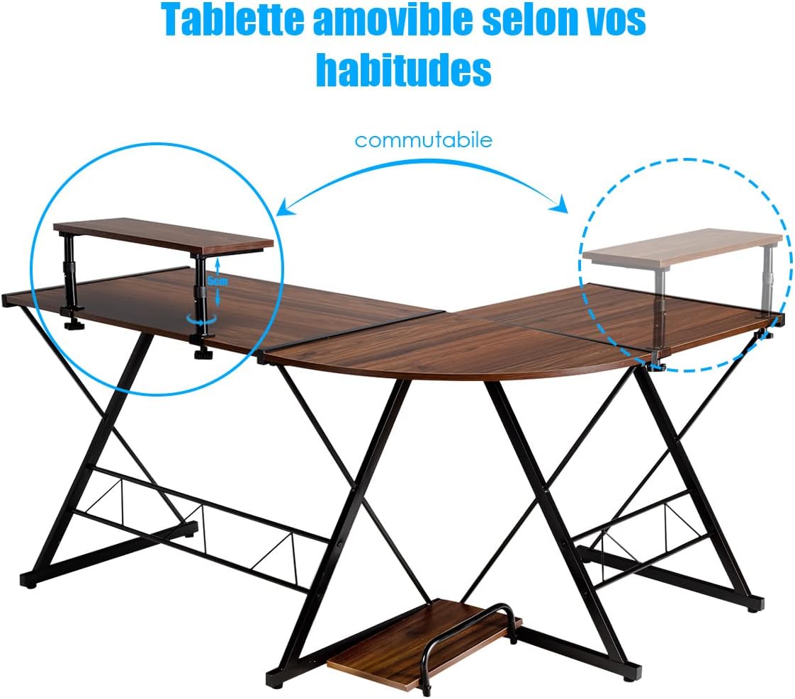 Description du produit.Notre bureau en forme de L avec 2 plateaux rectangulaires de différentes tailles et un quart de cercle d'une largeur de 56 cm offre suffisamment d'espace de stockage pour accueillir votre ordinateur, clavier, accessoires de bureau. De plus, il y a une étagère de l’écran amovible qui peut être installée des deux côtés. Plus particulièrement, les deux tables rectangulaires peuvent être utilisées séparément. Sa structure de support en forme de X et les pieds réglables en bas assurent la stabilité de la poste de travail. Le bureau d’angle peut être placé où vous le souhaitez. Rapportez-le chez vous si vous adorez !