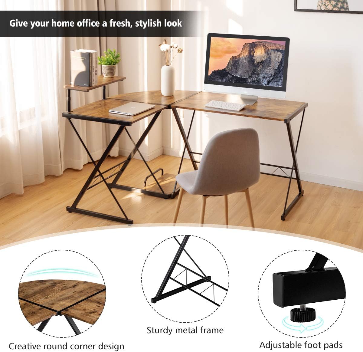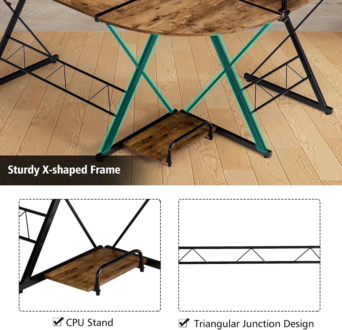 - Structure Robuste : Soutenu par la structure fiable en métal pulvérisé antirouille, le bureau d'ordinateur ne se déforme pas facilement et peut être utilisé pendant longtemps. De plus, les pieds réglables vous permettent d'utiliser le poste de travail en forme de L sur un sol inégal.