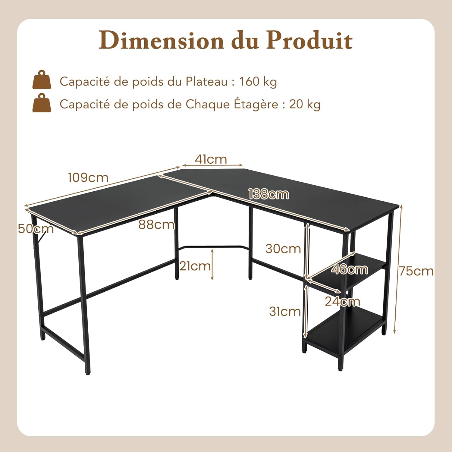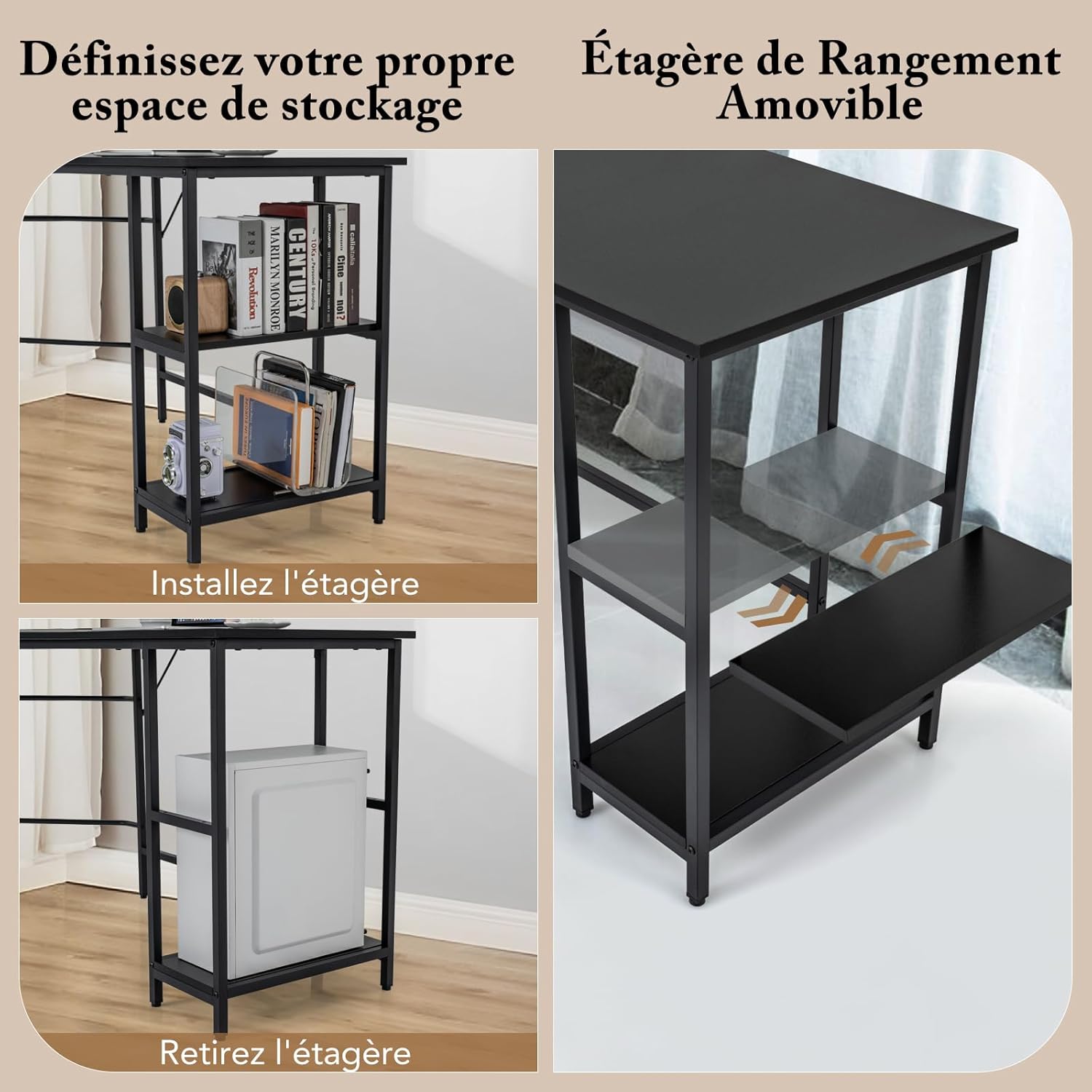 - 𝐄𝐬𝐩𝐚𝐜𝐞 𝐝𝐞 𝐑𝐚𝐧𝐠𝐞𝐦𝐞𝐧𝐭 𝐒𝐩𝐚𝐜𝐢𝐞𝐮𝐱 # Doté d'un plateau en forme de L et de deux étagères, le bureau d'ordinateur offre un espace ample pour étaler des documents, soutenir plusieurs moniteurs et ranger vos fournitures de bureau de manière pratique.