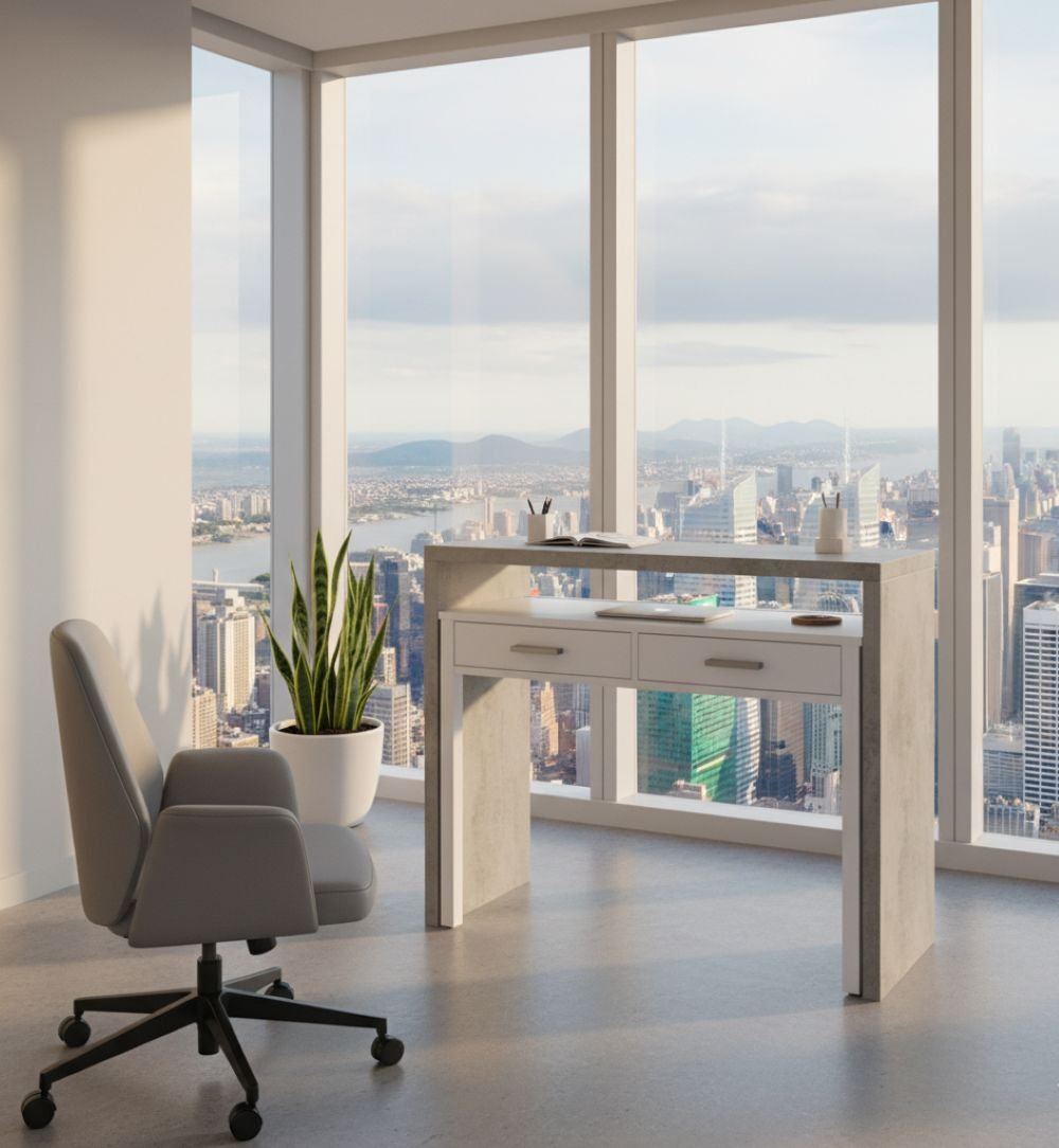 BUREAU - Bureau avec plateau extensible, bureau PC avec 2 tiroirs, 99x36h88 cm, Ciment et Blanc. STRUCTURE ET UTILISATION - Bureau pouvant ètre utilisè comme bureau ou comme table polyvalente, composè d'un plateau extensible, il convient pour meubler un bureau, un bureau, une chambre, un couloir ou une entrèe - Pièce moderne, pratique, fonctionnelle et peu encombrante de meubles est la solution pour meubler les petits espaces - Grâce à sa structure extensible particulière, ce bureau multifonctionnel est parfait car il est ègalement très utile pour travailler à domicile. CERTIFICATIONS ET INNOVATIONS - Article d'ameublement design certifiè PEFC, parfait pour meubler un environnement moderne et lumineux: le produit idèal pour ceux qui recherchent un produit fonctionnel et peu encombrant pour leur maison ou leur appartement - Garantie de 2 ans à partir de la date d'achat - Livrè dèmontè avec un livret d'instructions de montage. CARACTÉRISTIQUES TECHNIQUES - Produit en bois lamellè d'une èpaisseur de 30 mm et 15 mm, matèriau rèsistant aux chocs et aux rayures, durable et impermèable - Chants avec finition mèlamine - Classification selon la teneur ou le dègagement de formaldèhyde de TYPE E1 - Tiroirs non -extractible - Poignèes ABS - Poids maximum supportè par tiroir: 5 Kg - Poids maximum supportè par bureau: 25 Kg. DIMENSIONS EN CM - Bureau: Longueur: 98,5 Largeur: 36 Hauteur: 87,5 - Capacitè tiroirs: 38x30h8
