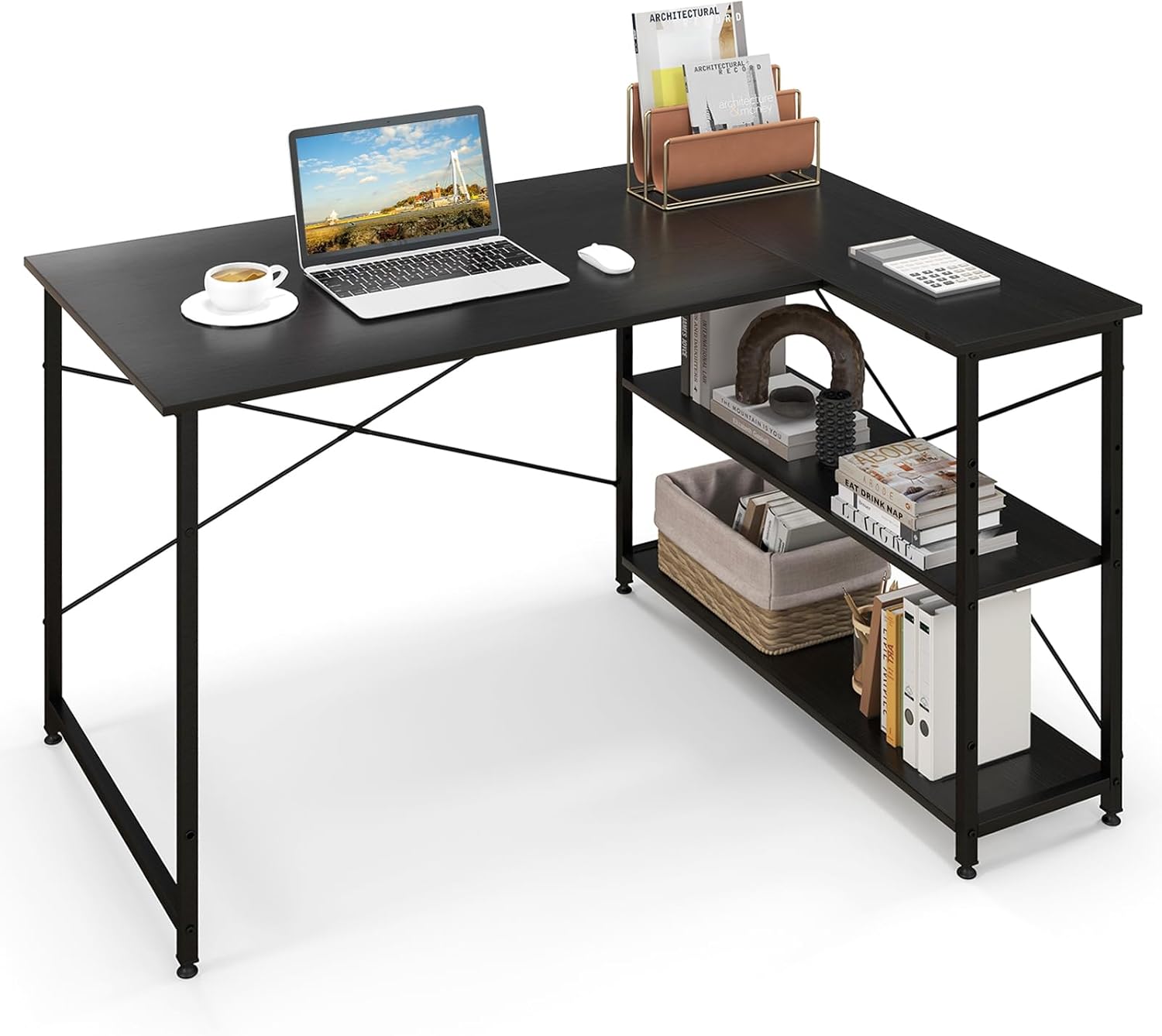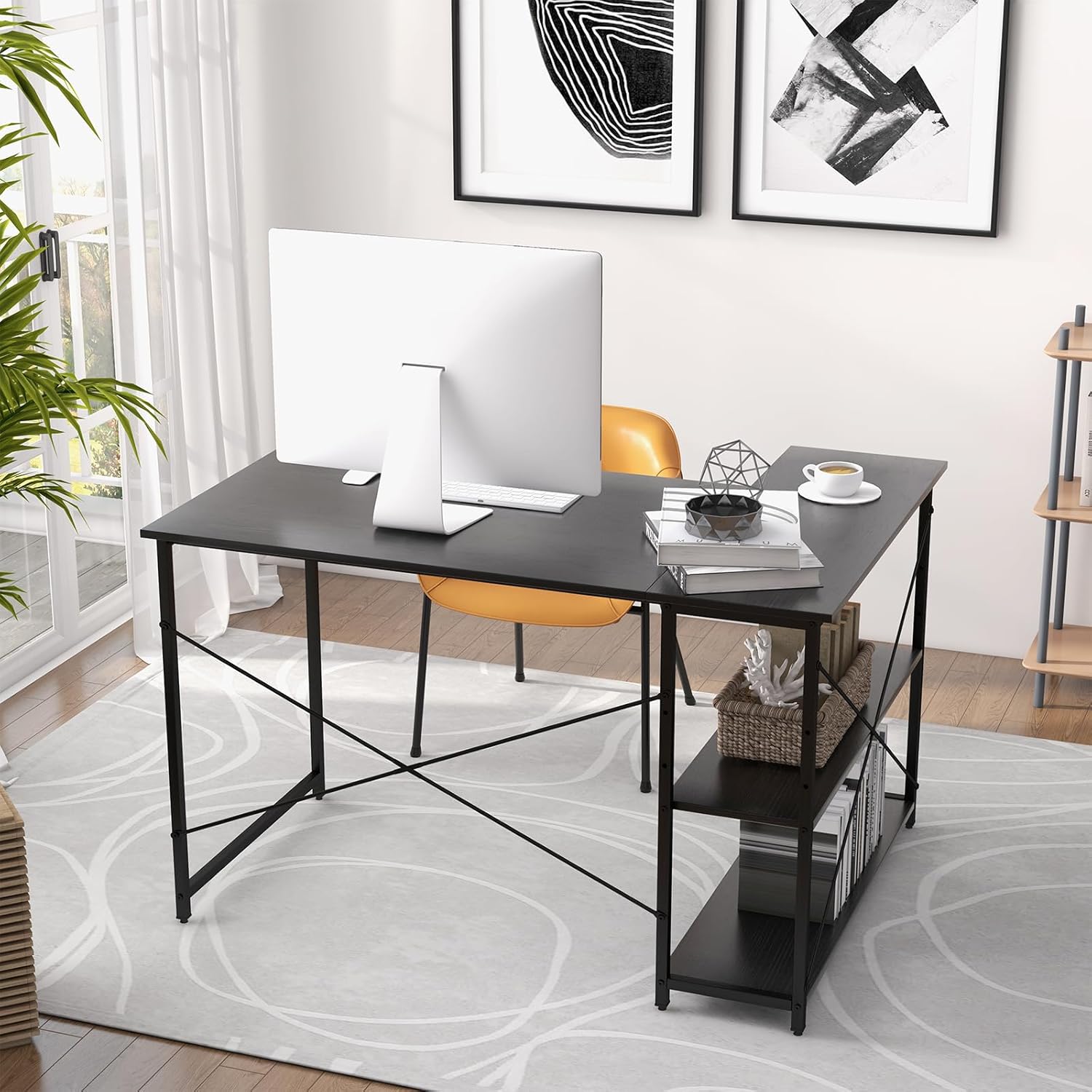 Bureau de bibliothèque de bureau en forme de l, bureau d'angle avec étagère à 2 étagères,industriel noir