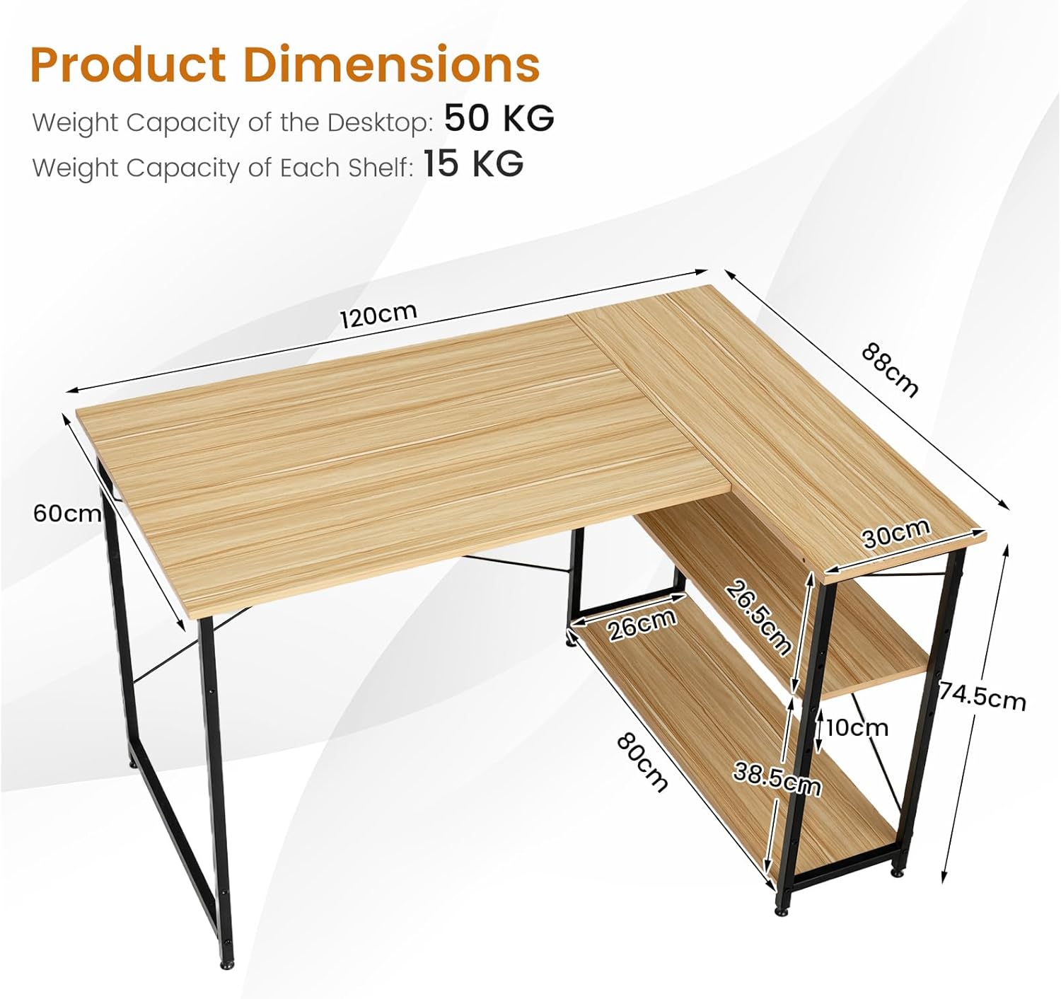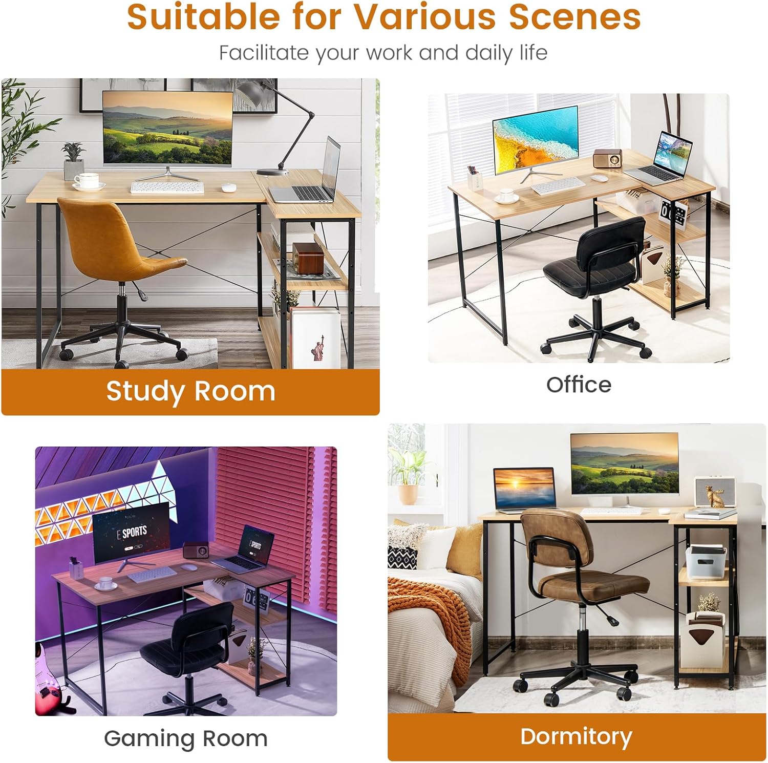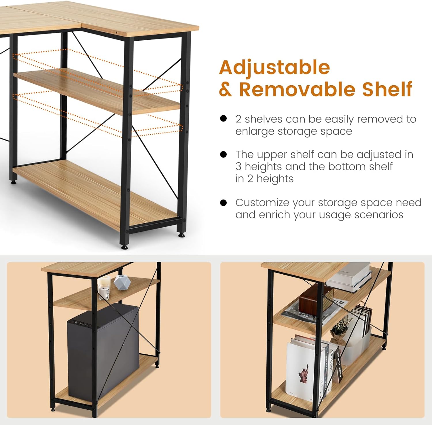 - Design réversible : le bureau en forme de L est équipé de 2 étagères réversibles, qui peuvent être placées à gauche ou à droite en fonction des préférences personnelles et de la disposition spatiale de la pièce. En outre, l'étagère supérieure dispose de 3 hauteurs réglables et l'étagère inférieure a 2 hauteurs réglables, qui peuvent accueillir des objets de différentes tailles.