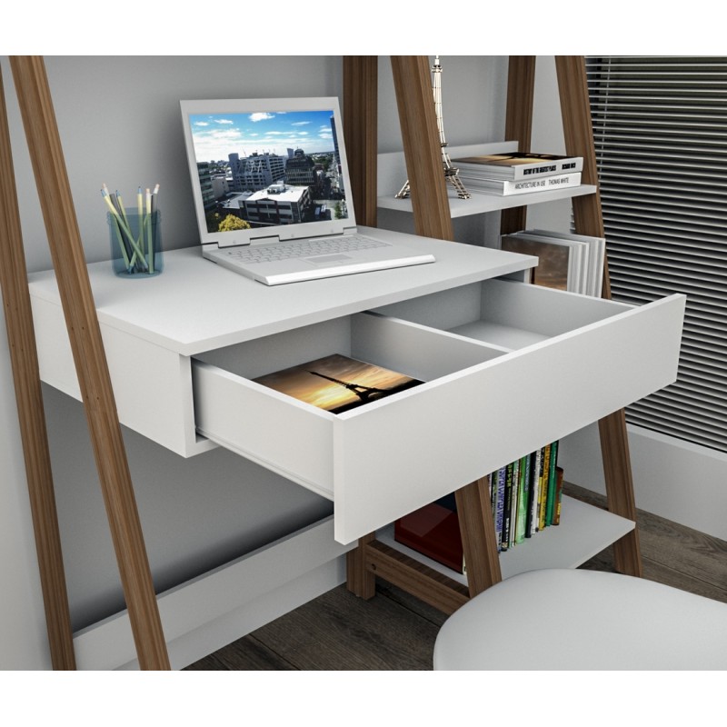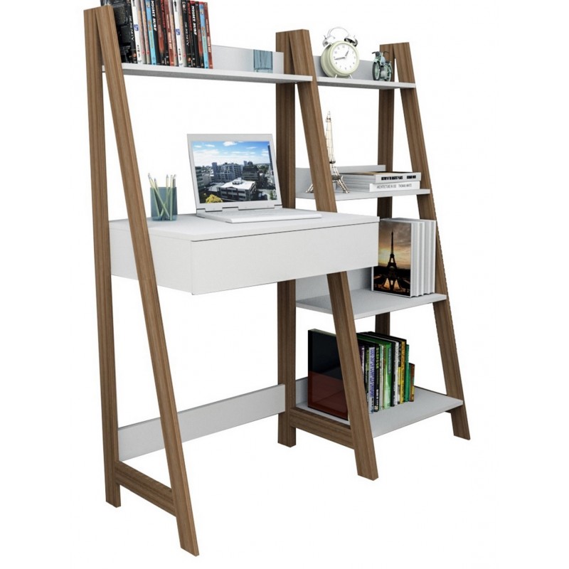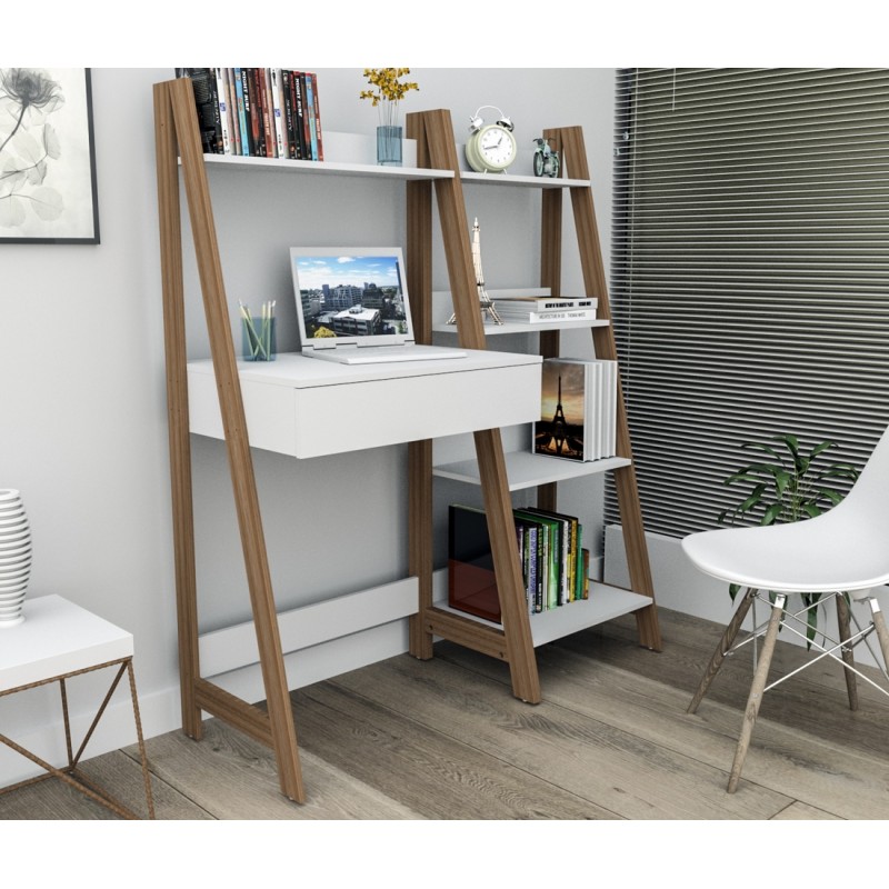 Bureau Echelle avec Etagère Blanc et Châtaignier
