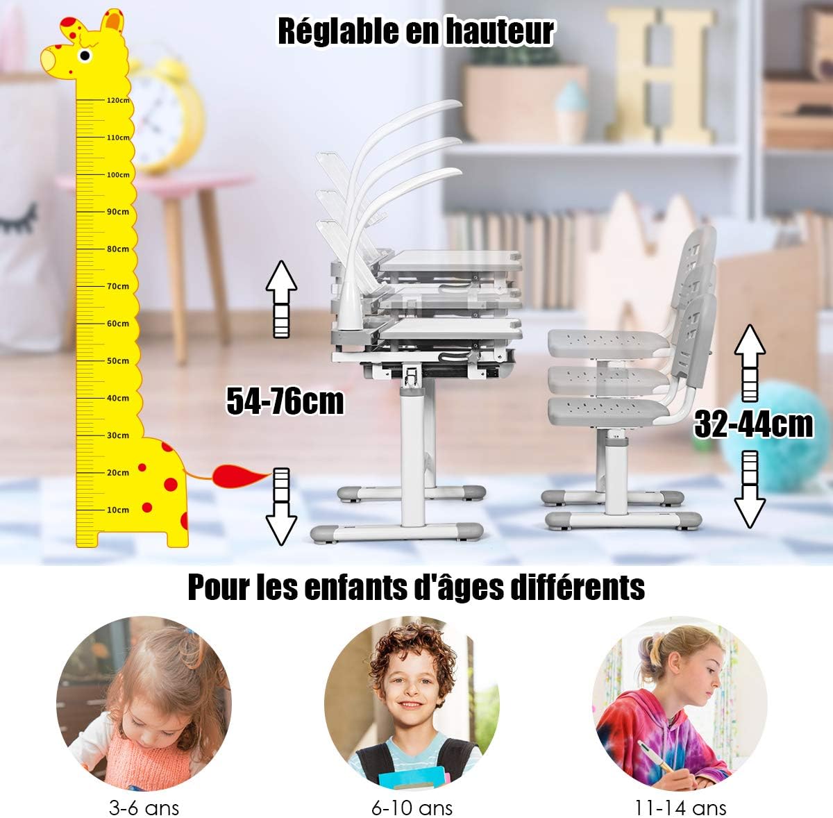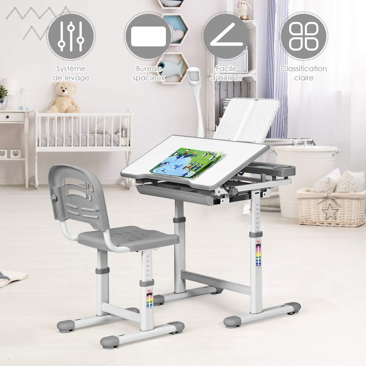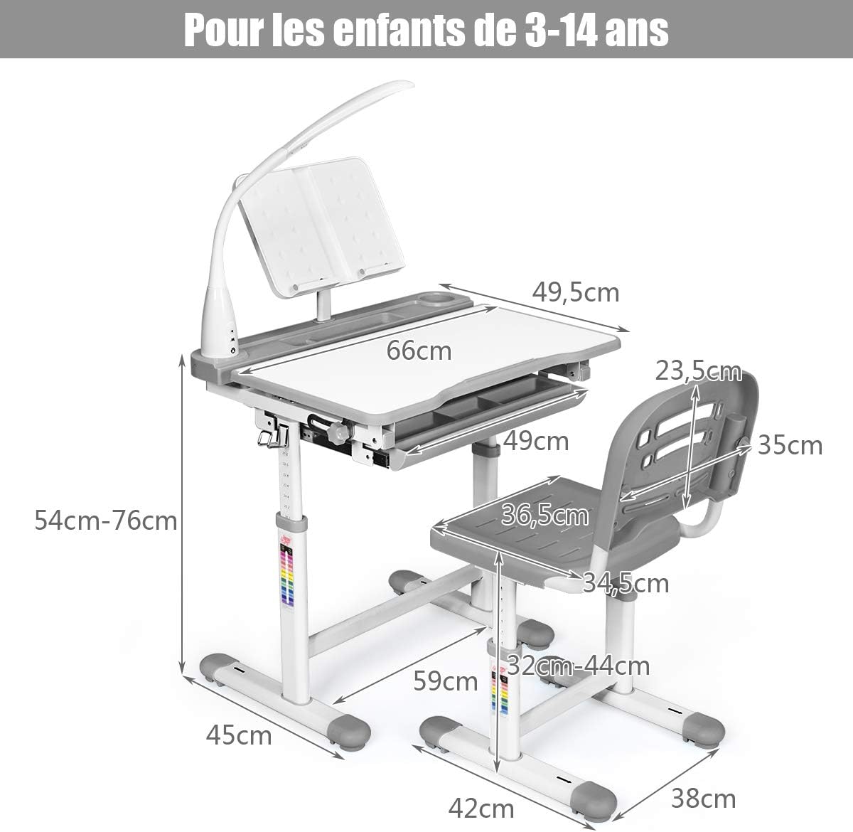 | Libellé | Bureau enfant avec chaise hauteurs réglables, angle de bureau réglable lampe de direction ajustable support de livres tiroir de rangement gris |