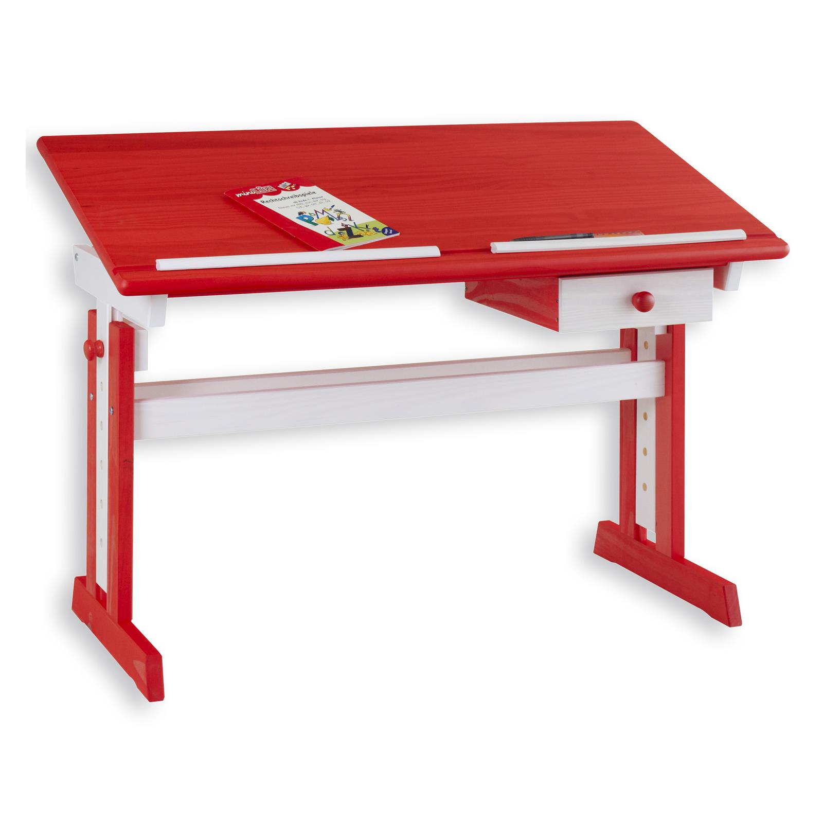 | Libellé | Bureau enfant écolier junior FLEXI table à dessin réglable en hauteur et pupitre inclinable avec 1 tiroir en pin lasuré blanc rouge |