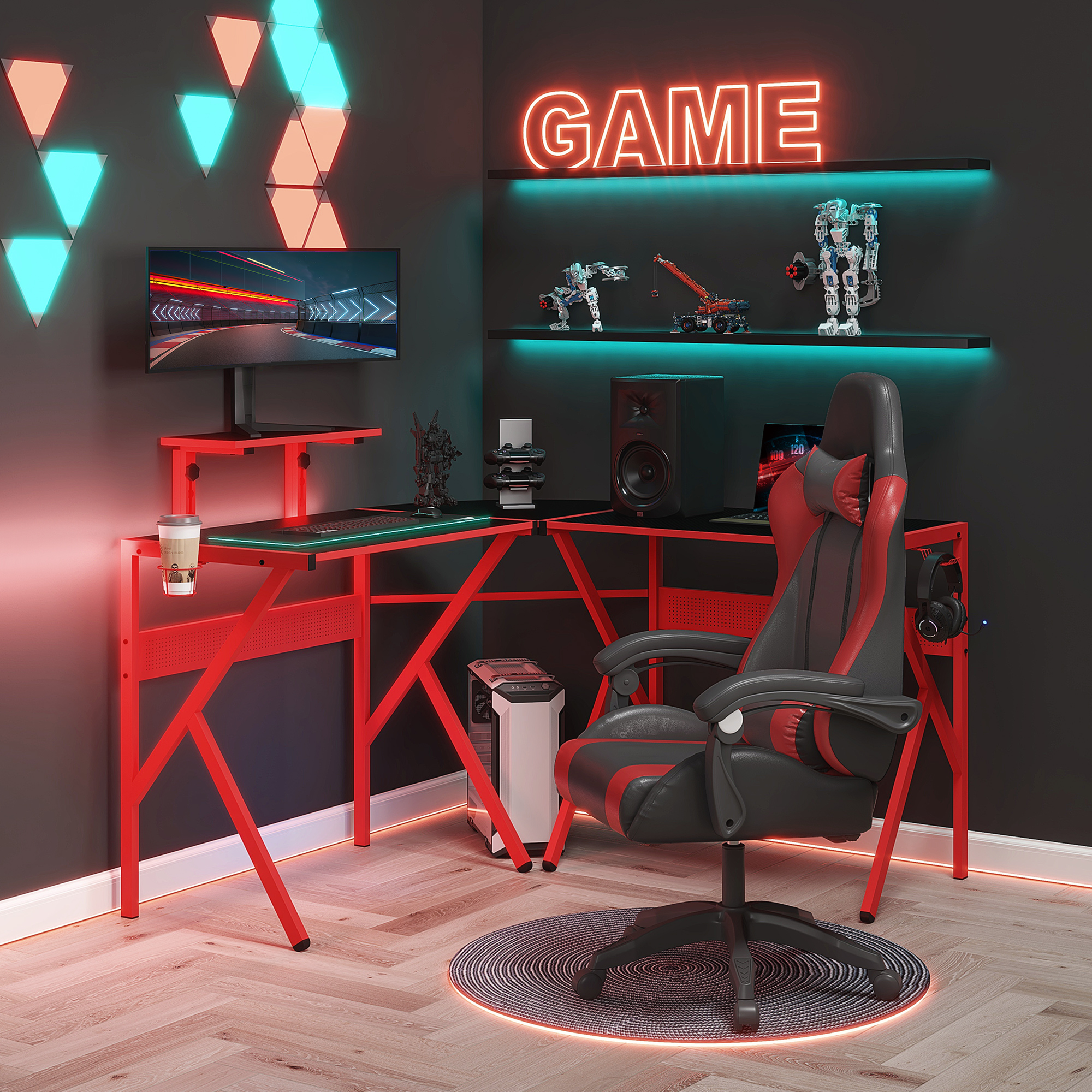 Bureau gaming d'angle bureau gamer bureau informatique bracket casque porte-gobelet étagère écran réglabl